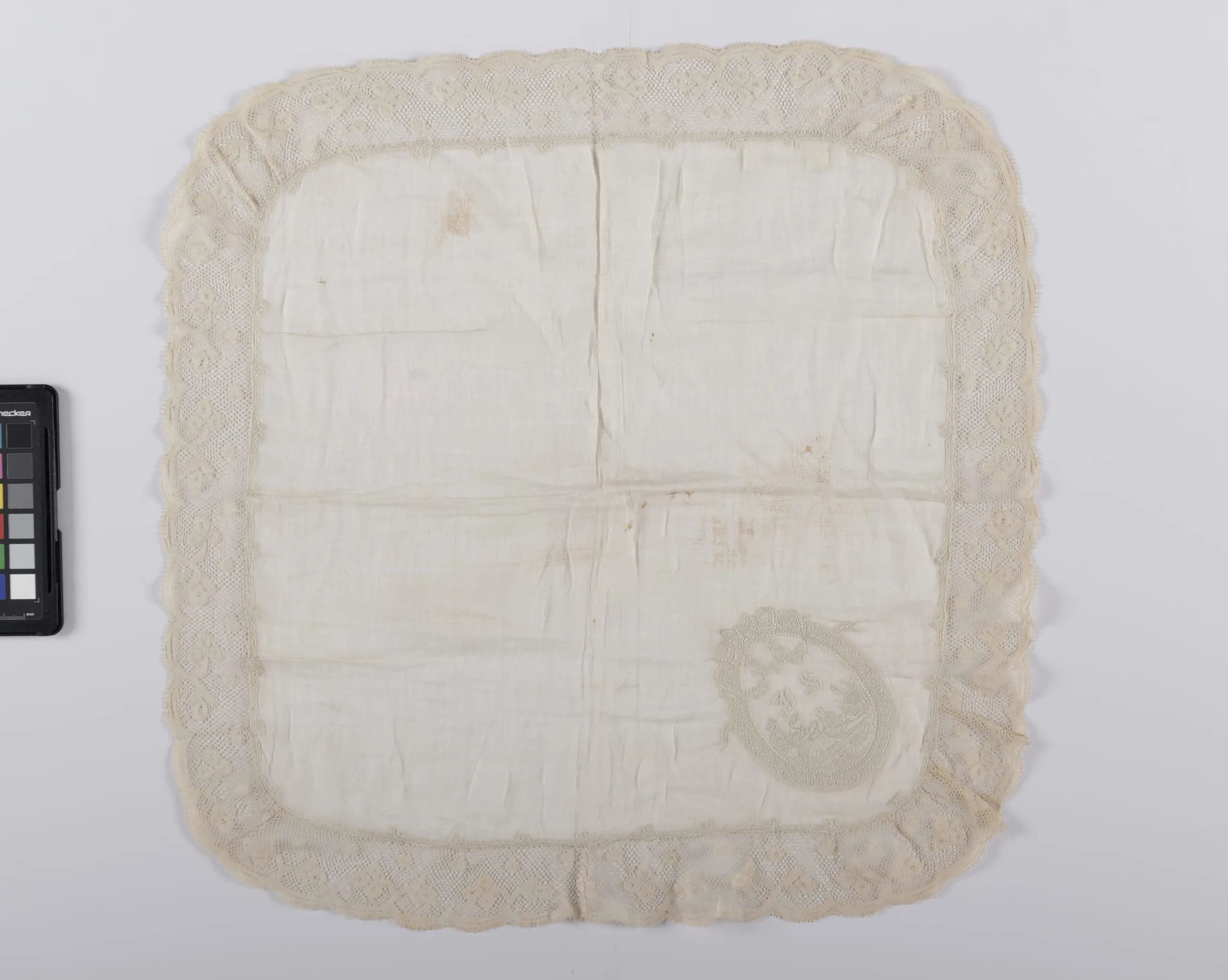 - Linen plain weave with cotton lace (Valenciennes d'ypres) and silk embroidery
