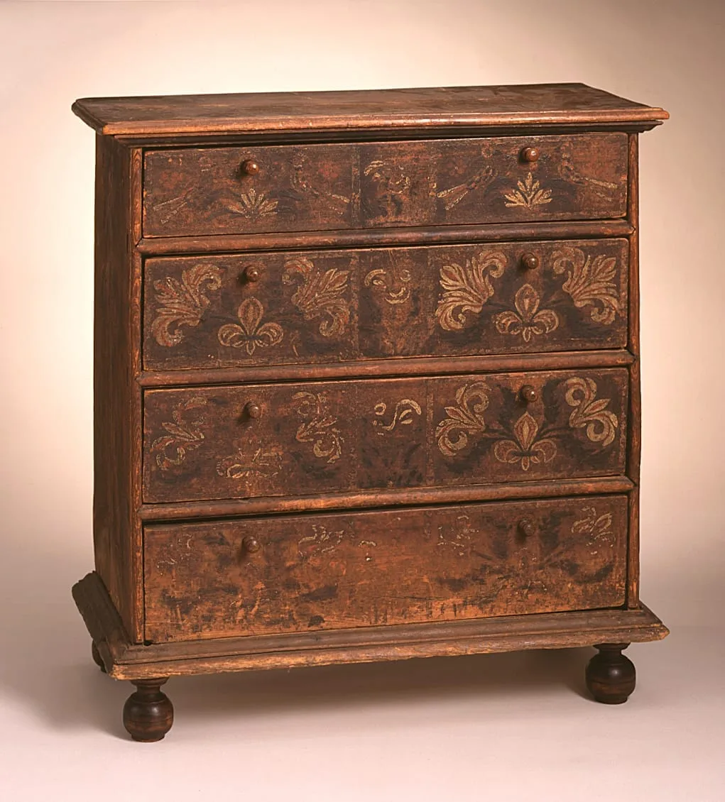 In many ways this chest cheerfully pretends to a status it does not possess. The once-vivid painted decoration of birds, fleurs-de-lis, and flowers was intended to suggest the elaborate inlaid and japanned designs found on more complicated European pieces. The painted decoration relates to other examples generally attributed to coastal Connecticut.