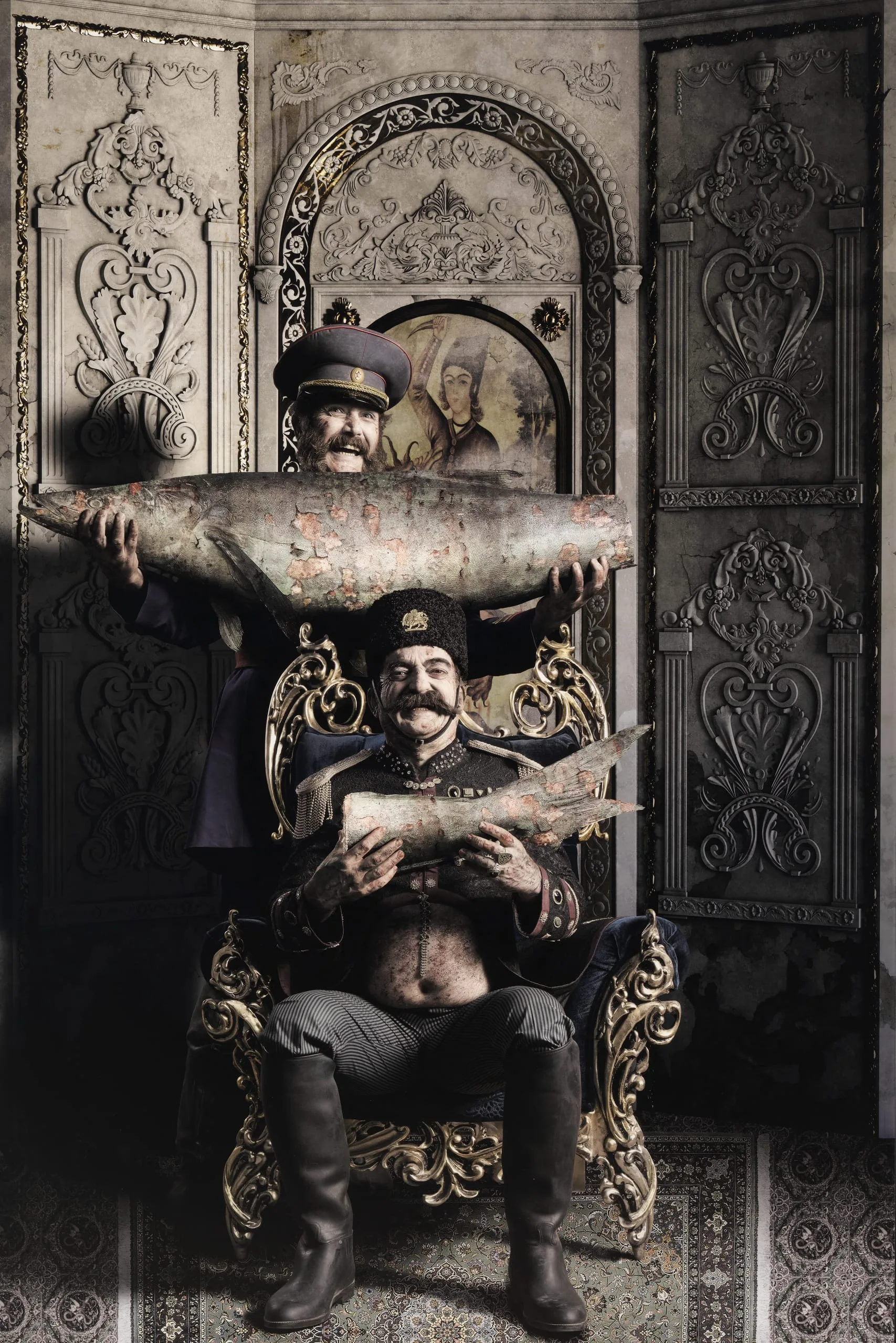 One of the many challenges of Nasir al-Din’s reign was the escalating interference of England and Russia as each sought control over traditional Persian territories. In a pair of prints (see M.2016.138.5), Filizadeh ironically emphasizes the shah’s impotence against such foreign domination, personified by the ambassadors from these countries. Here, the Russian ambassador smugly holds aloft the better part of a large sturgeon from the Caspian Sea, while Nasir al-Din happily makes do with the tail end. The unequal division of the fish serves as a reminder of Russian designs to dominate the Caspian coast. The shah’s royal attire is now mixed with loose pants and fishing boots, combining his royal image with an outdoorsy persona for adventures in cultural diplomacy, or rather, for the Russian ambassador to have his way with the shah.