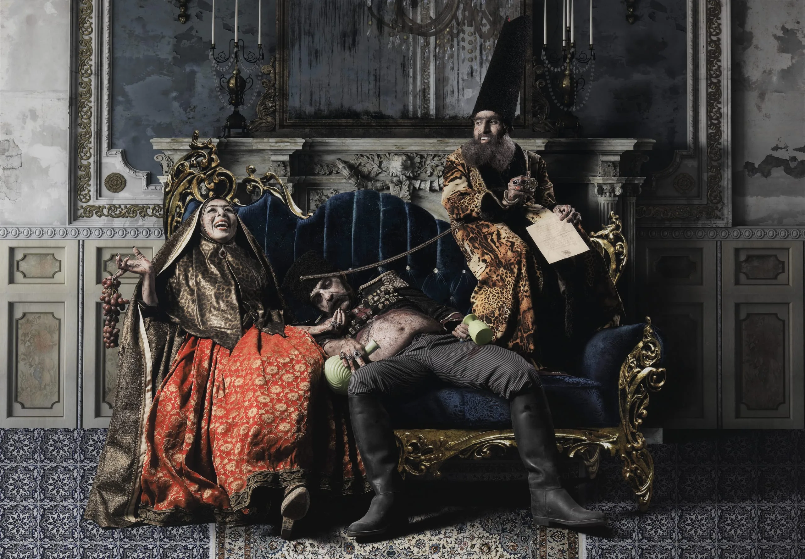 Amidst his growing impotence against foreign ambassadors, Conspiracy imagines the moment before a critical turn in the shah’s reign. Staged against the same palace setting as the portrait of Anis al-Dawla, Nasir al-Din Shah is now passed out on the settee, clutching a wine bottle and empty cup in his hands while the shah’s mother, Mahd Ulya and her companion in political intrigue, Mirza Agha Khan Nuri, the new prime minister, sit beside him, seemingly pleased with themselves. The prime minister holds an official-looking document with the Persian state symbol at the top, possibly the shah’s death warrant for Amir Kabir, his recently deposed prime minister, mentor, and brother-in-law. The photograph creates a stark contrast between the drunken and disheveled shah and his triumphant manipulators.