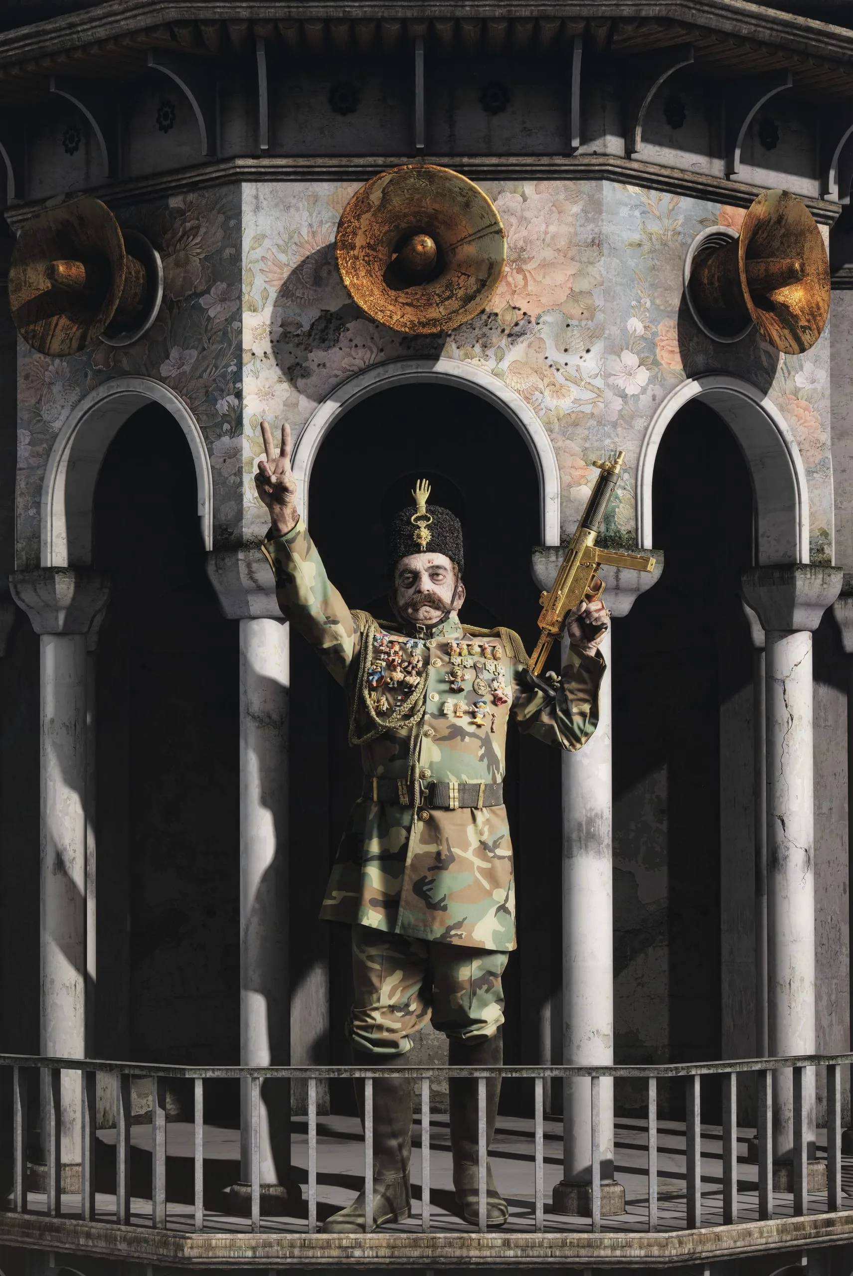Clothed in camouflage gear decorated with children’s pins rather than medals and military insignia, and armed with an Uzi, the shah gives the victory symbol from a balcony. The scene perhaps suggests Nasir al-Din’s bravura, self-delusion, and public deception, for his adventures generally ended in defeat. Modern-day elements, including the automatic weapon, serve as reminders that this type of prevarication for political ends is not restricted to the past. For Filizadeh, this moment represents the celebration after the English departure from Iran, bringing a bit of joy to the shah’s otherwise depressed spirit due to the ongoing interference by foreign powers.
