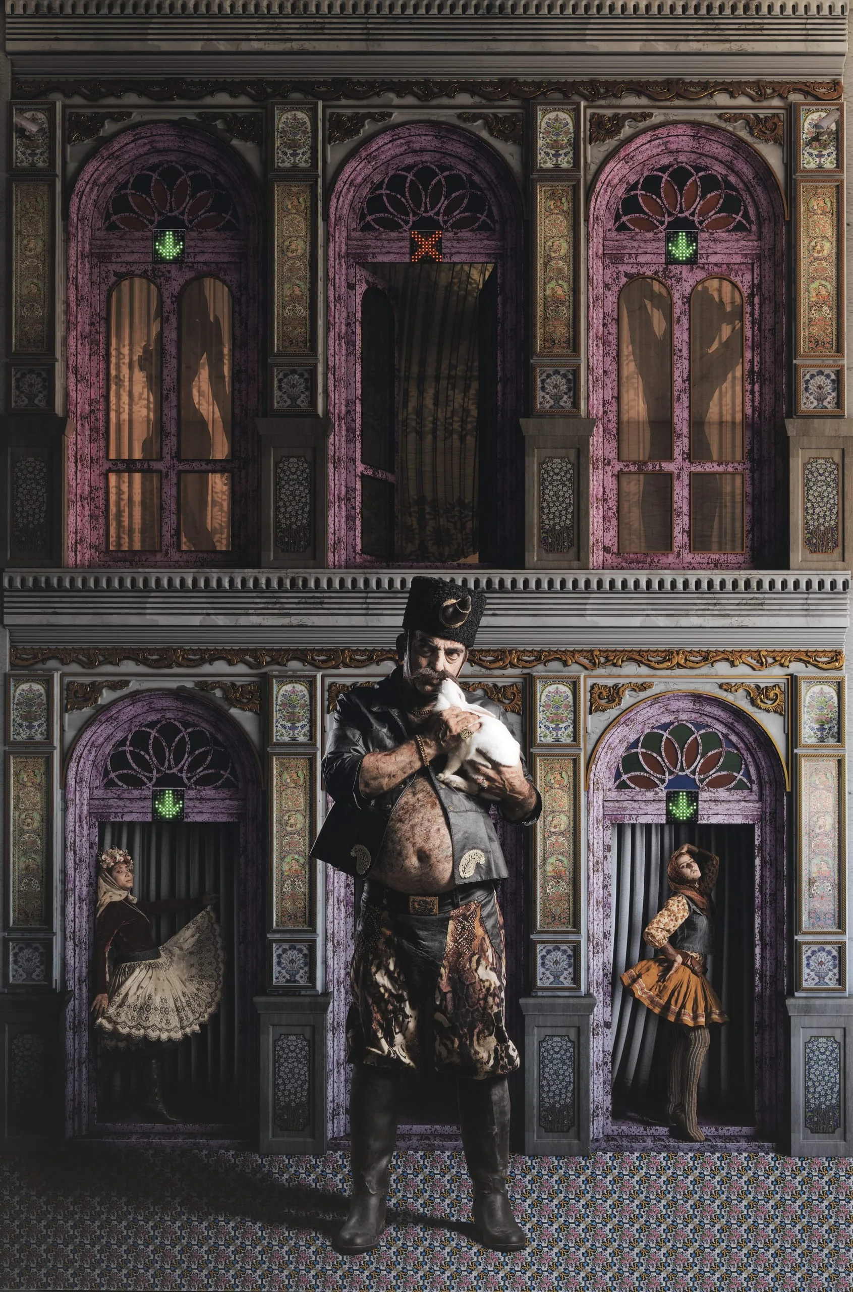 Details of Nasir al-Din’s family life and lovers are preserved in a variety of sources, his own photographs of the royal harem among them. Women, and not only his domineering mother, Mahd Ulya, but also several of his wives, left their mark on his reign. Here the artist imagines the harem as a bordello, although the shah is more interested in his rabbit than in the temptations of his wives. In addition to Jayran and Anis al-Dawla, who stand provocatively in doorways on the lower level, on the upper floor, two other women, seemingly nude and posed in a sexualized manner behind sheer curtains, have their availability signaled by green elevator-like arrows above their windows.