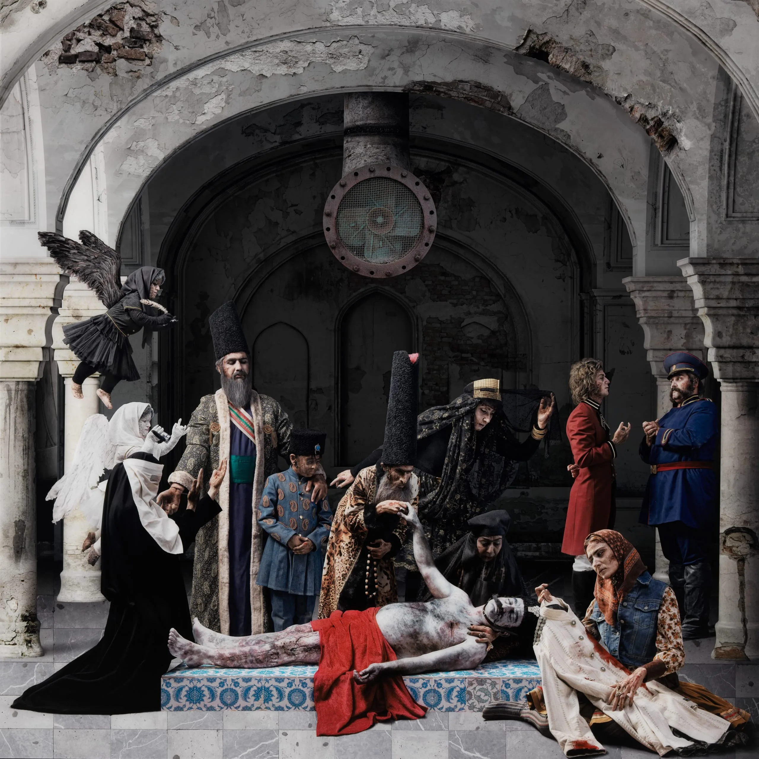Nasir al-Din Shah was assassinated May 1, 1896 while visiting a shrine south of Tehran to give thanks for the soon-to-be celebrated fiftieth anniversary of his reign. Legend has it that with his last breath he asked to be moved to Jayran’s nearby tomb, or perhaps he claimed “I will rule you in a different manner, if I live,” the inspiration for Filizadeh’s series. The scene here pertains to an account of how after the body of the shah had been washed, there was difficulty locating the appropriate ceremonial shroud. It reunites some of the key characters from Nasir al-Din’s life as depicted in this series. As in other scenes, it includes the pair of black- and white-clad angels, one of them holding a video camera and the other a quill pen. As now becomes relevant, these are the recording angels who in Muslim belief chronicle a person’s good and bad deeds in preparation for Judgment Day.