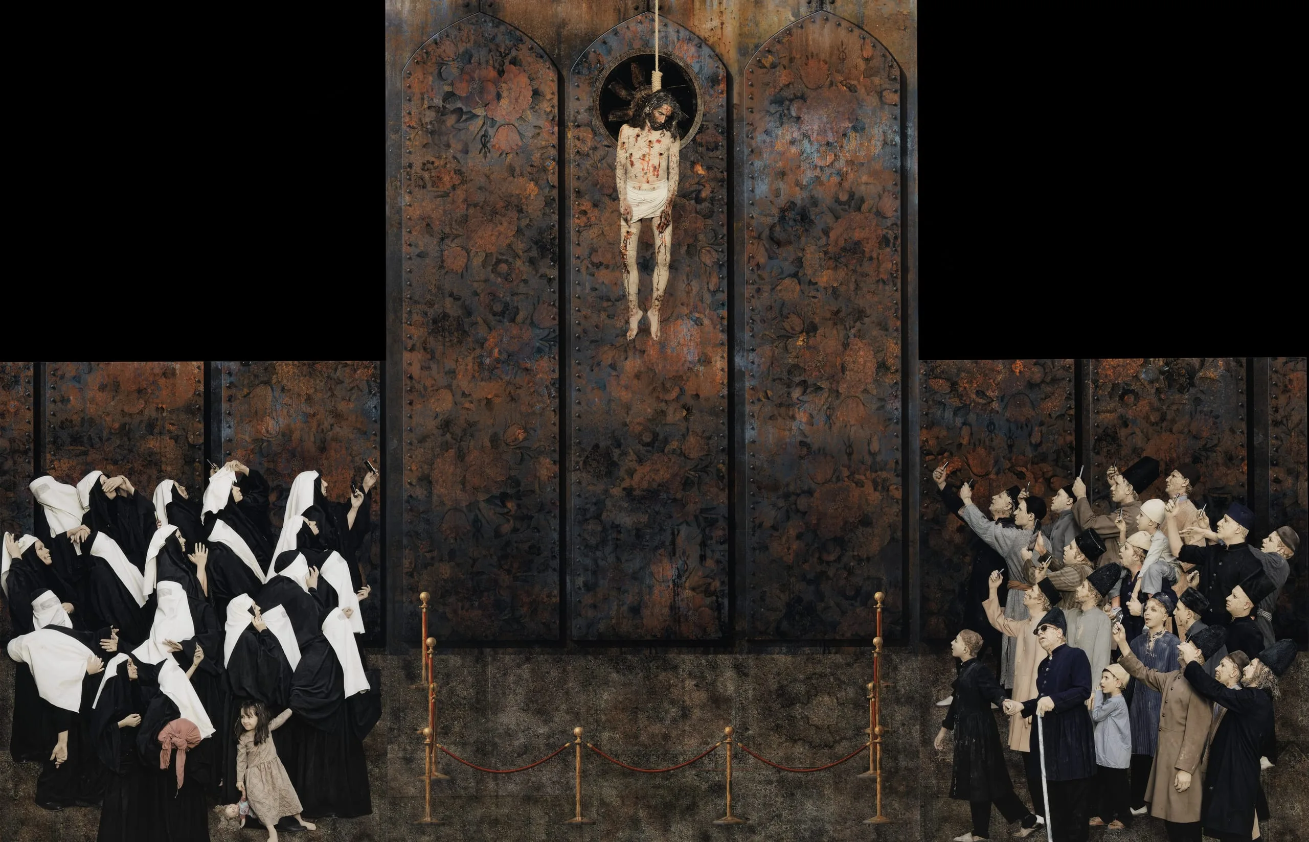 The penultimate scene in the series is the assassin’s public hanging conceived as a grand Baroque triptych. The bloody, Christlike figure of Mirza Riza hangs limply at the center; a velvet-roped stanchion below helps hold back the assembly of onlookers who crowd the two side panels. Segregated by gender, the mob, many of whom with distraught faces, experience the execution in an entirely contemporary manner—through cell phone cameras—except for a single blind man, who seems unaware of the fateful event.