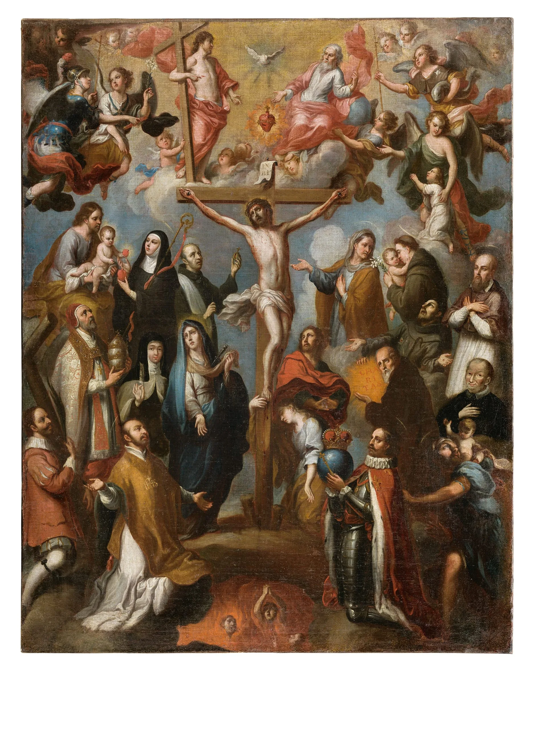 Oil painting, multi-figure religious composition centered on a crucifixion scene surrounded by saints, angels, and kneeling figures in tiered heavenly and earthly zones