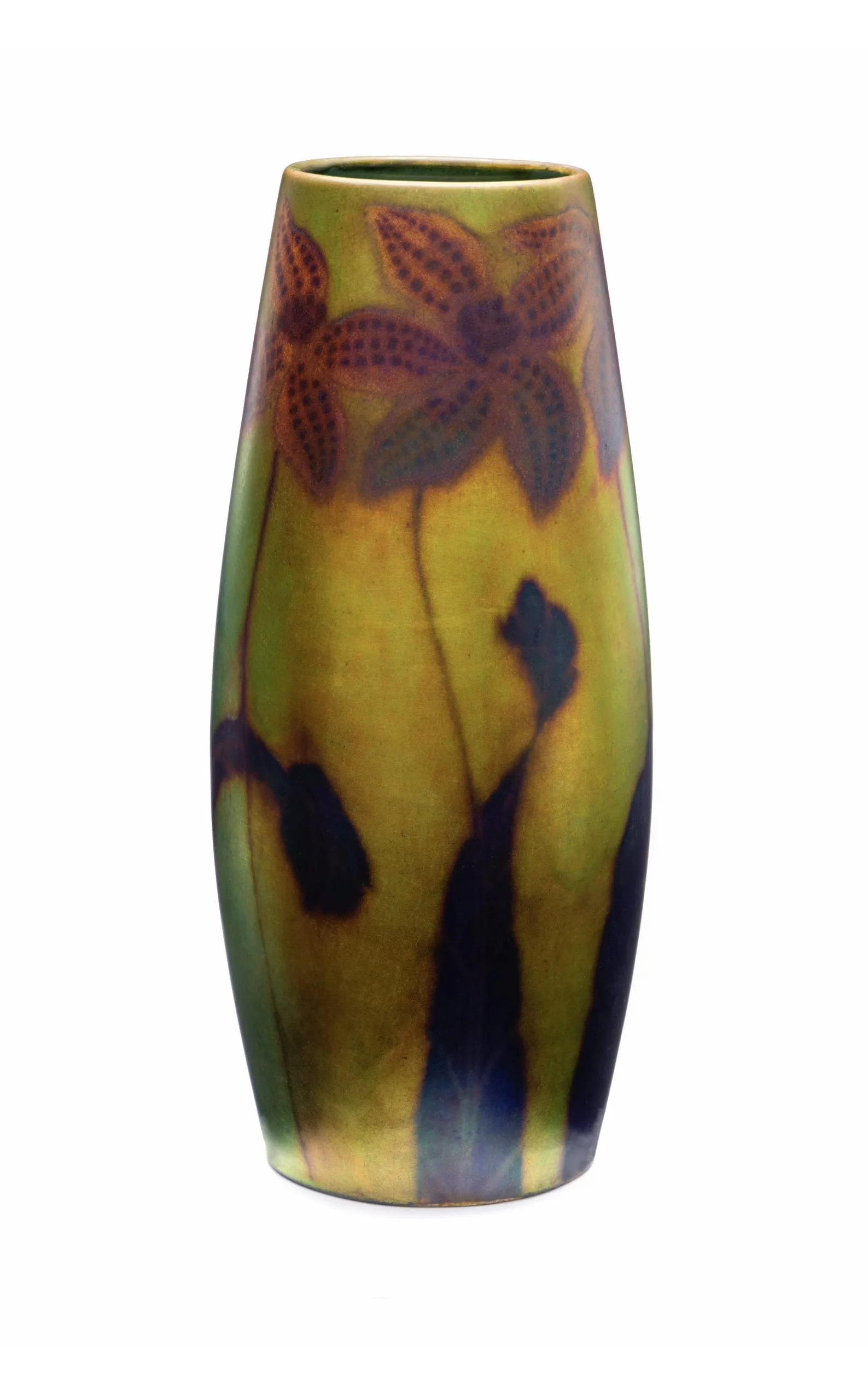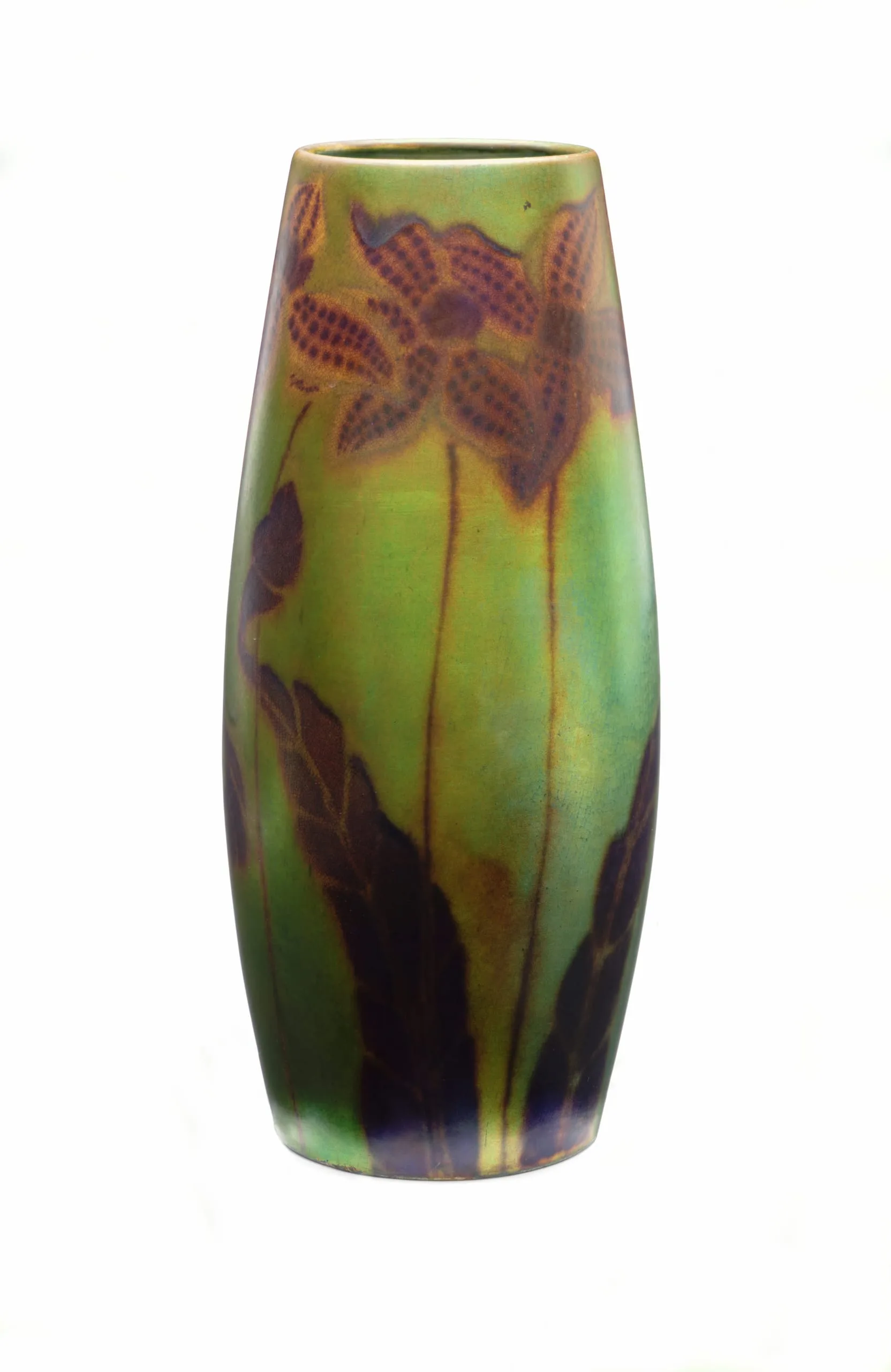 By the end of the nineteenth century, the Zsolnay pottery works in Pécs, Hungary had become one of the leading ceramic manufacturers in Europe. Founded in 1853 as a small stoneware and earthenware factory, the company expanded its range of products during this period to include artistic wares in a variety of styles, from ancient to modern. Miklós Zsolnay, grandson of the company’s founder, spearheaded this transformation, while his father, Vilmos Zsolnay, was instrumental in technological developments like the metallic luster glaze he called "eosin." The glaze, which appears on this vase, especially complemented the sinuous motifs of the then fashionable Art Nouveau style. It initially distinguished Zsolnay’s finest products from those of its competitors but was soon subject to imitation (a mark of its immediate popularity). LACMA has four other examples of Zsolnay pottery in the collection (two shown at the 1911 "International Exhibition of Industrial Art in Turin"), but this is the only one to feature the firm’s luminous eosin glaze.