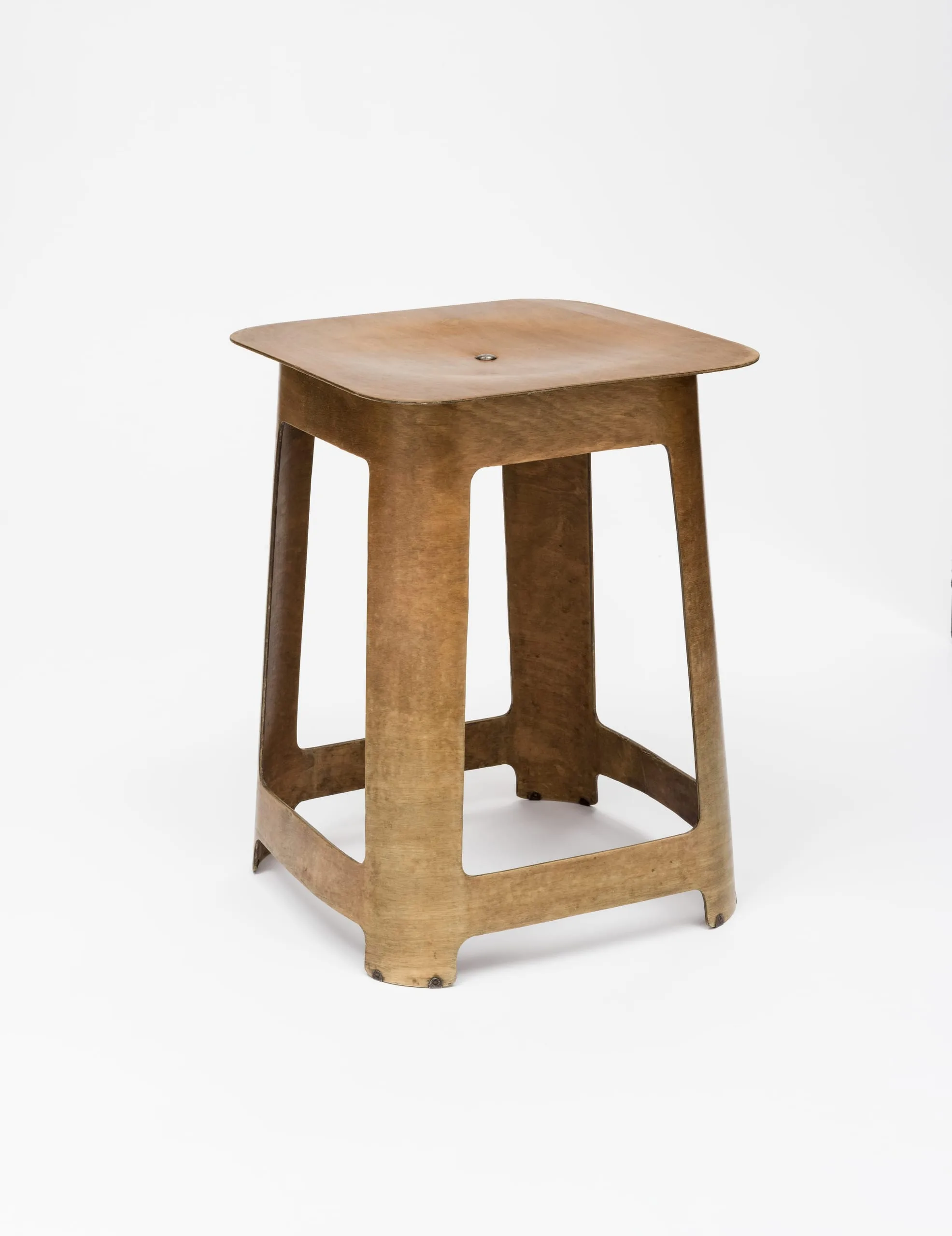 Founded in 1929, Isokon was the first company in Britain solely devoted to constructing modernist apartments and houses, and soon after, manufacturing plywood furniture for them: this plywood stool is the first style they produced. Jack Prichard, who started the furniture part of the company in 1935, immediately hired German émigré Walter Gropius as the "Controller of Design" (a grand term for a tiny experimental endeavor). While a variant of this stool had been in production for a few years earlier, this particular version was modified by Gropius, as documented by drawings signed by him and now at the Victoria & Albert Museum.