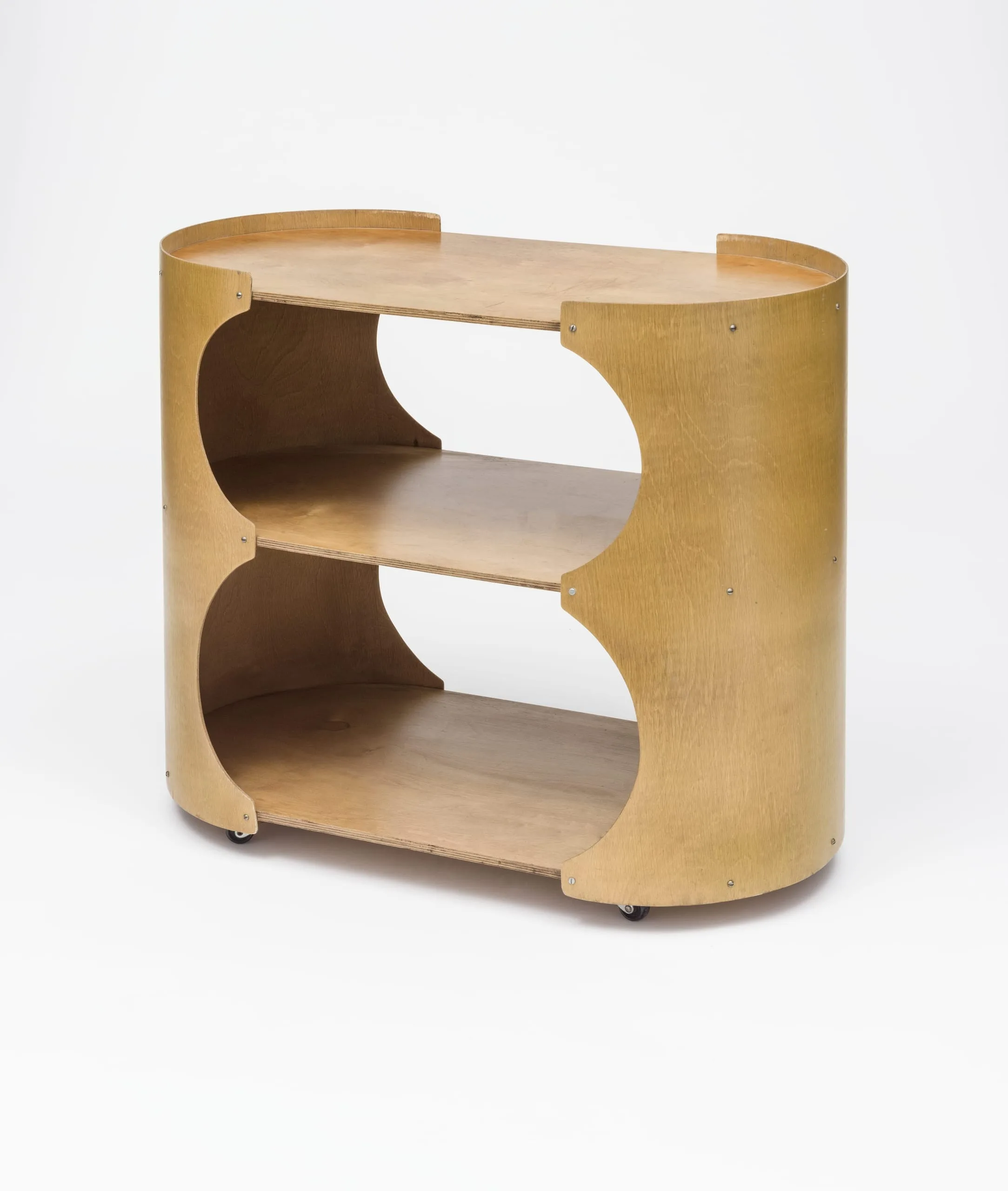 Designed about 1935, this trolley demonstrates Ambrose Heal’s continuing commitment, as chairman of the company, to providing simple, attractive, reasonably priced design. For this role, he was knighted in 1933 and named a royal designer for industry in 1939. Very few British companies were experimenting with breakthroughs in plywood technology developed in the late 1920s, and this Heal’s example contributes to LACMA’s rich collections of the material that made Charles and Ray Eames world famous.