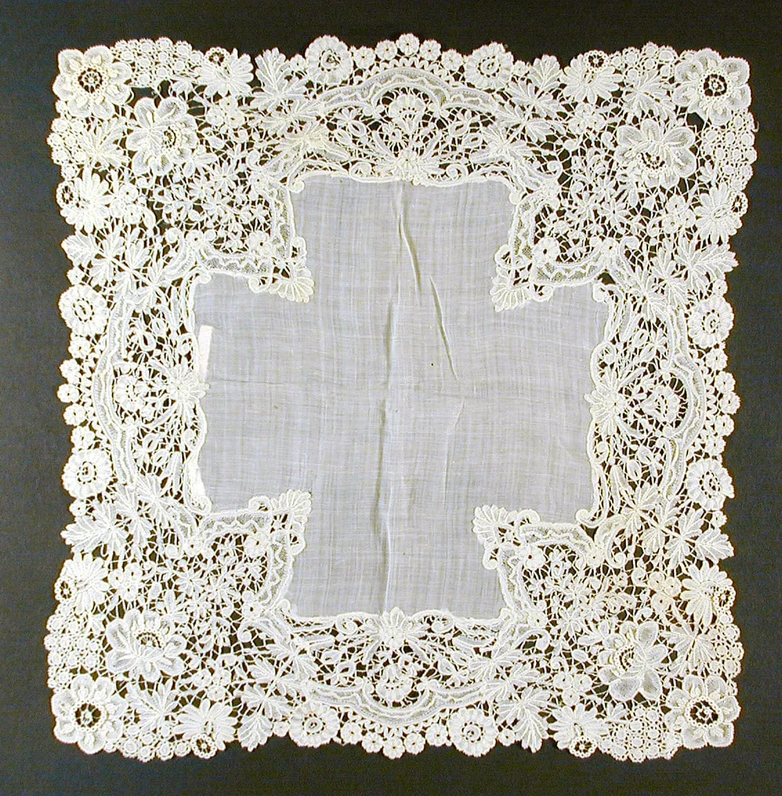 Square lace-bordered textile with a plain woven center panel and a wide, densely worked ivory lace border of raised floral and foliate motifs with scalloped outer edge