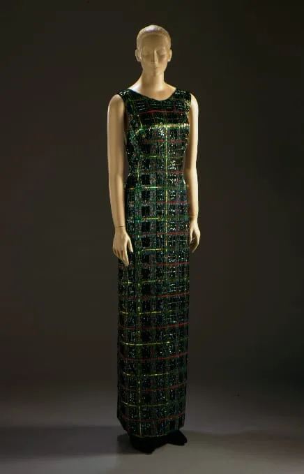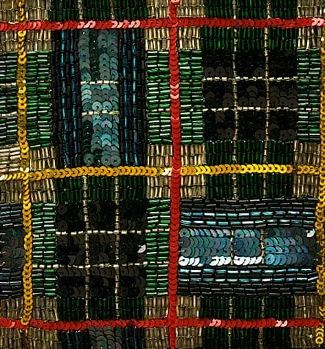 - Glass beads, metallic sequins, and platic sequins, with silk gauze and silk plain weave (crepe chiffon)