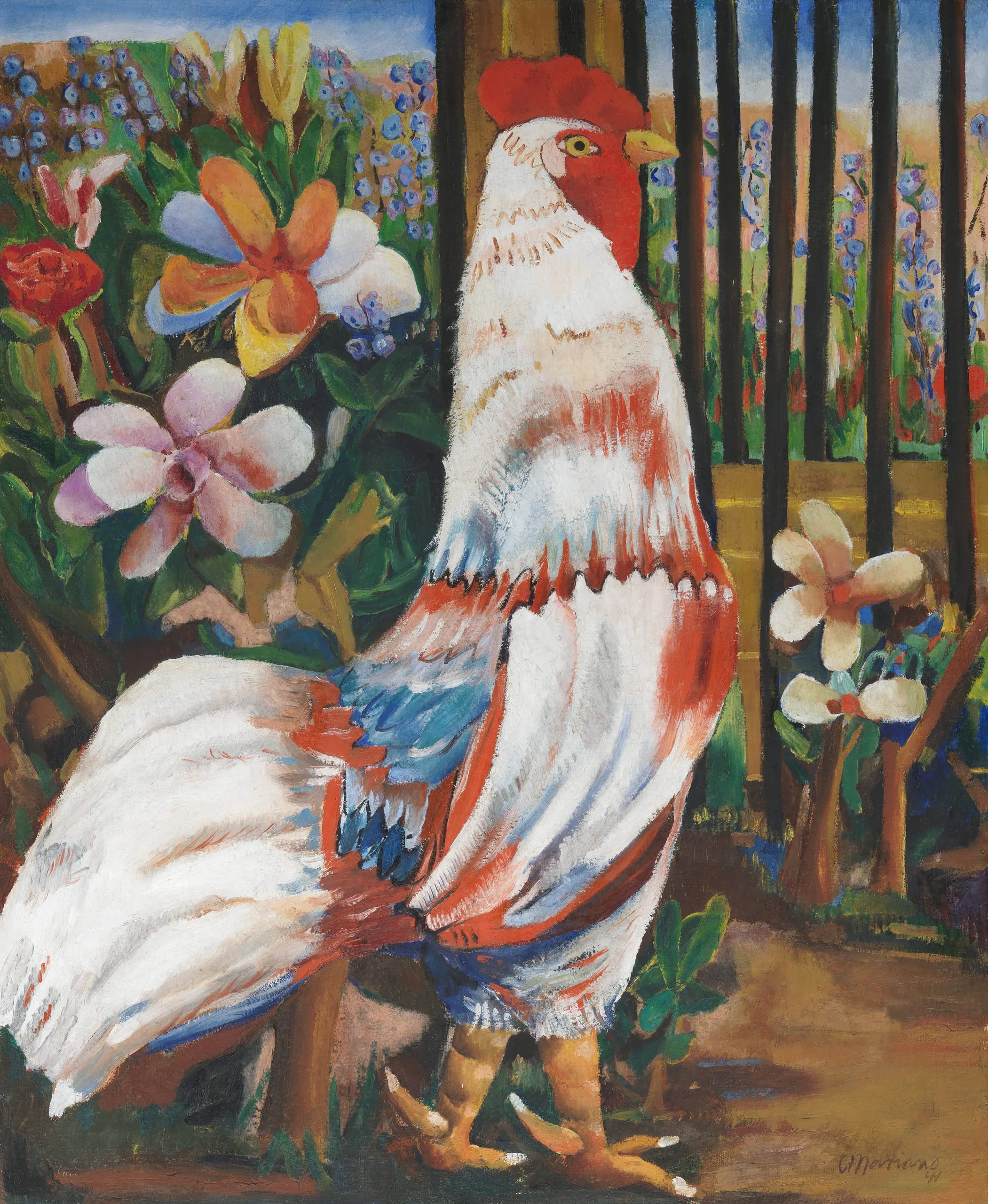 Avant-garde Cuban artist Mariano Rodríguez (known as Mariano) created many paintings of roosters throughout his career. Connected to traditions of rural guajiro farming communities and the Afro-Cuban religion Santería, the rooster is an iconic image of Cuban pride and masculinity. This painting features a single majestic rooster, with his feathers painted in the colors of the Cuban flag: red, white, and blue.