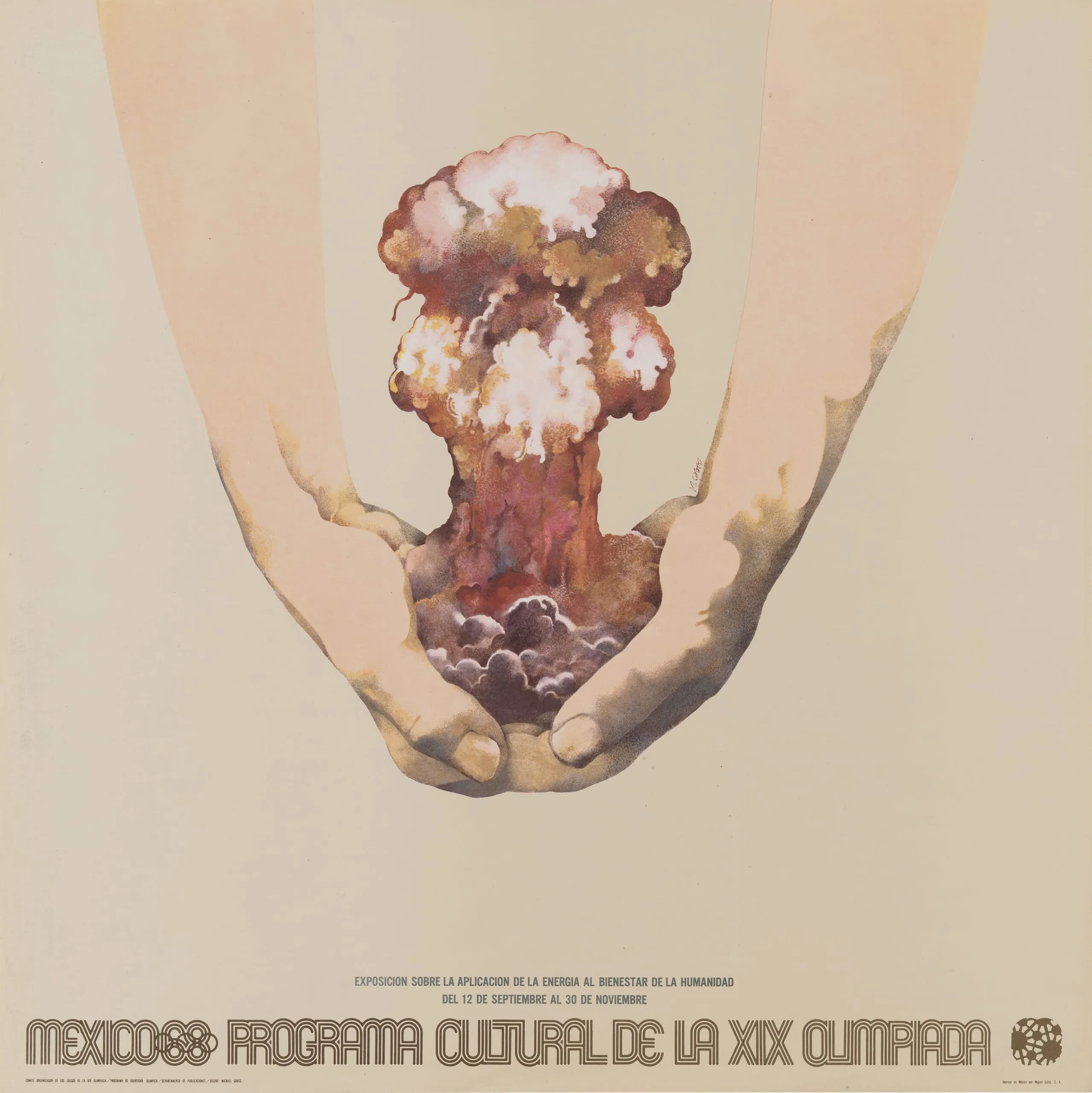 Offset lithograph poster showing two cupped hands holding a mushroom cloud, with bold Spanish text along the bottom reading 'Mexico 68 Programa Cultural de la XIX Olimpiada'