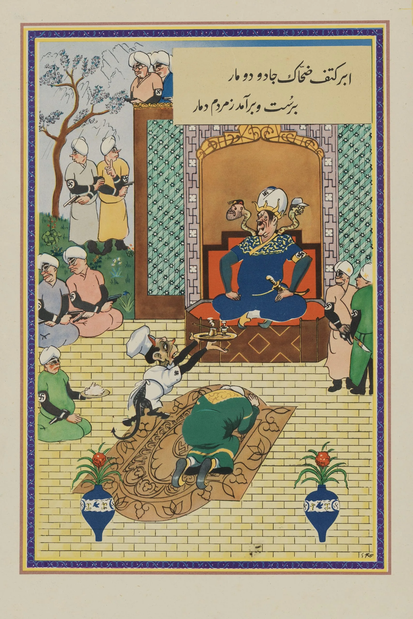 During World War II, as part of an effort to promote popular support for the Allies in Iran, the British government commissioned propaganda posters that utilized a key episode from the Iranian national epic, the Shahnama: the story of the wicked King Zahhak. Here and throughout the series, Hitler is portrayed as the evil Zahhak, who has a pair of snakes growing from his shoulders with the heads of Mussolini and Tojo; the chief minister of Nazi propaganda, Goebbels, is represented as Satan, in the guise of Zahhak-Hitler’s cook.