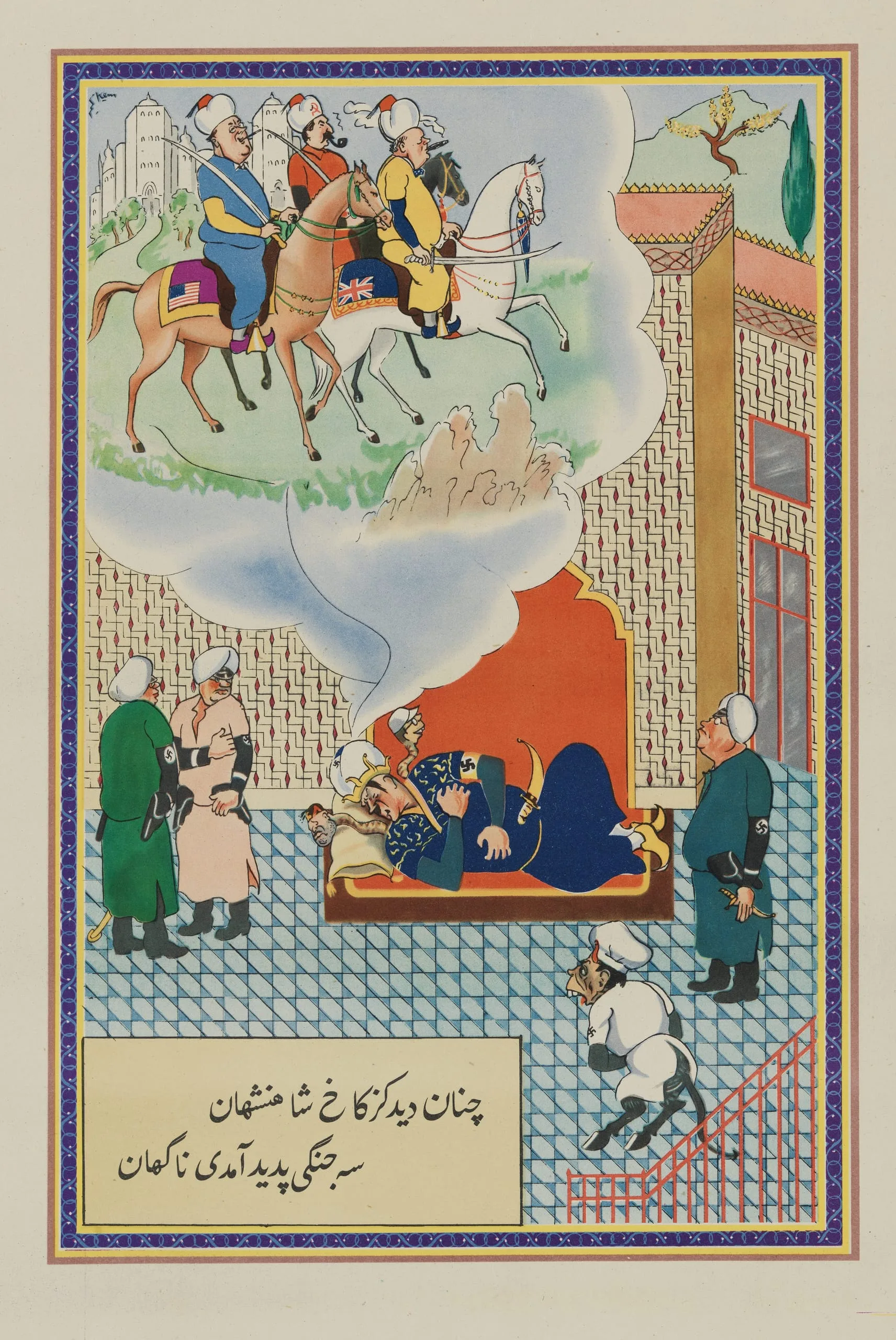 During World War II, as part of an effort to promote popular support for the Allies in Iran, the British government commissioned propaganda posters that utilized a key episode from the Iranian national epic, the Shahnama: the story of the wicked King Zahhak. Here and throughout the series, Hitler is portrayed as the evil Zahhak, who has a pair of snakes growing from his shoulders with the heads of Mussolini and Tojo; the chief minister of Nazi propaganda, Goebbels, is represented as Satan, in the guise of Zahhak-Hitler’s cook.