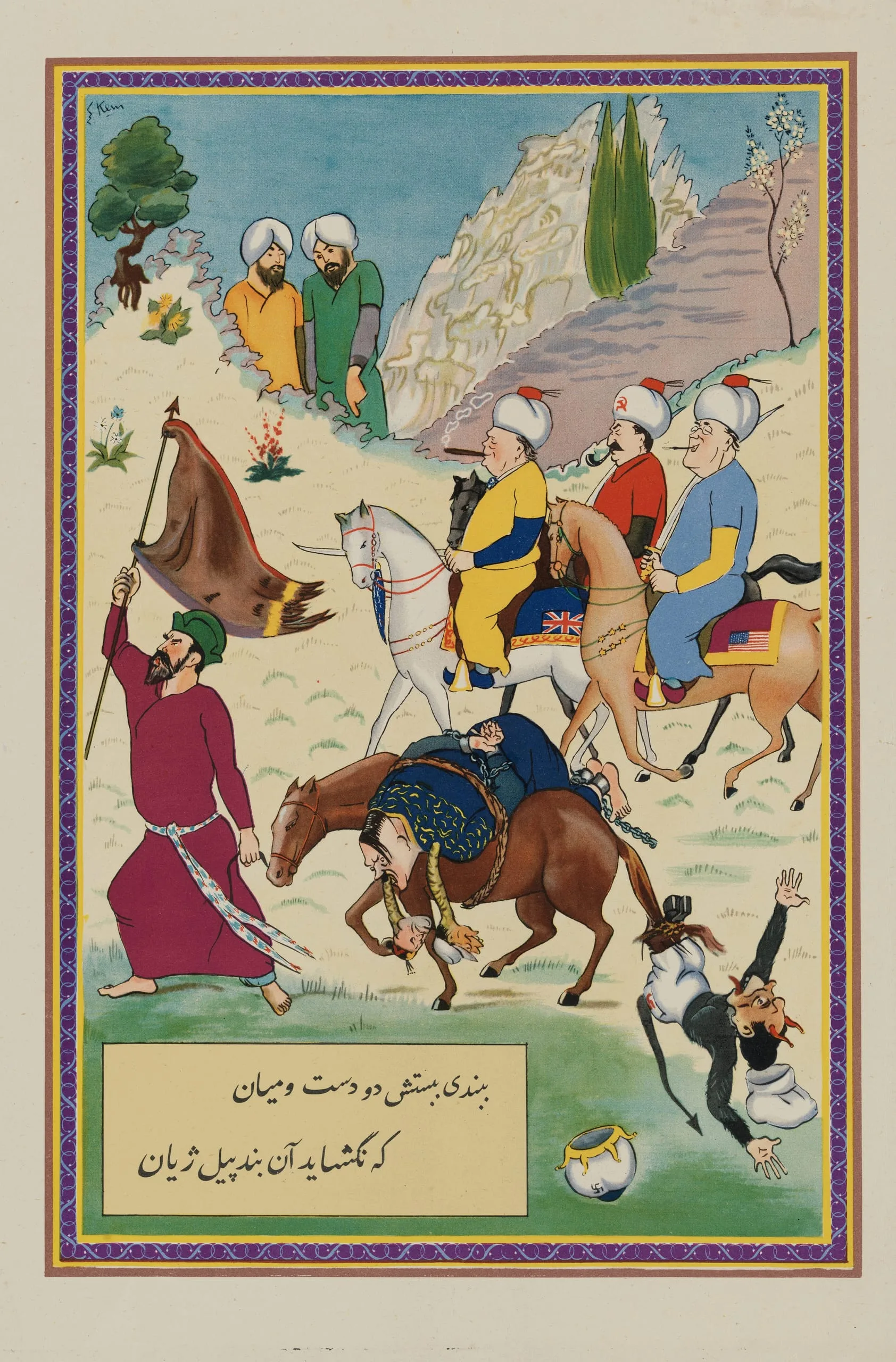 During World War II, as part of an effort to promote popular support for the Allies in Iran, the British government commissioned propaganda posters that utilized a key episode from the Iranian national epic, the Shahnama: the story of the wicked King Zahhak. Here and throughout the series, Hitler is portrayed as the evil Zahhak, who has a pair of snakes growing from his shoulders with the heads of Mussolini and Tojo; the chief minister of Nazi propaganda, Goebbels, is represented as Satan, in the guise of Zahhak-Hitler’s cook.