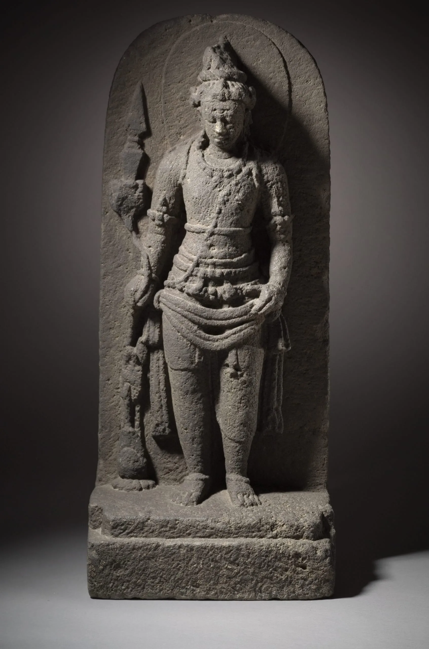 Like his Norse counterpart, Thor, the Vedic (proto-Hindu) deity Indra, was considered the god of lightning and thunder, and was intimately associated with the life-giving monsoonal rains. In this rare and possibly unique extant Central Javanese image of Indra (Brown 2008, 86-87), he can be identified by his primary attribute of the thunderbolt (vajra) that is positioned vertically on top of a lotus growing out of a vase beside his right foot, and by the horizontal eye on his forehead. His right hand holds the lotus stock and his left hand rests on his hip. He is nimbate, crowned, and wears profuse jewelry, including the Brahmanical sacred thread (yajnopavita) worn over his left shoulder. In addition to his religious role as the king of the gods, Indra also served an auxiliary function as a directional guardian (dikpala) in which he was the Divine Regent of the East (see M.2013.57a-b). In this context, the image may have been erected in a subsidiary shrine devoted to the directional guardians.