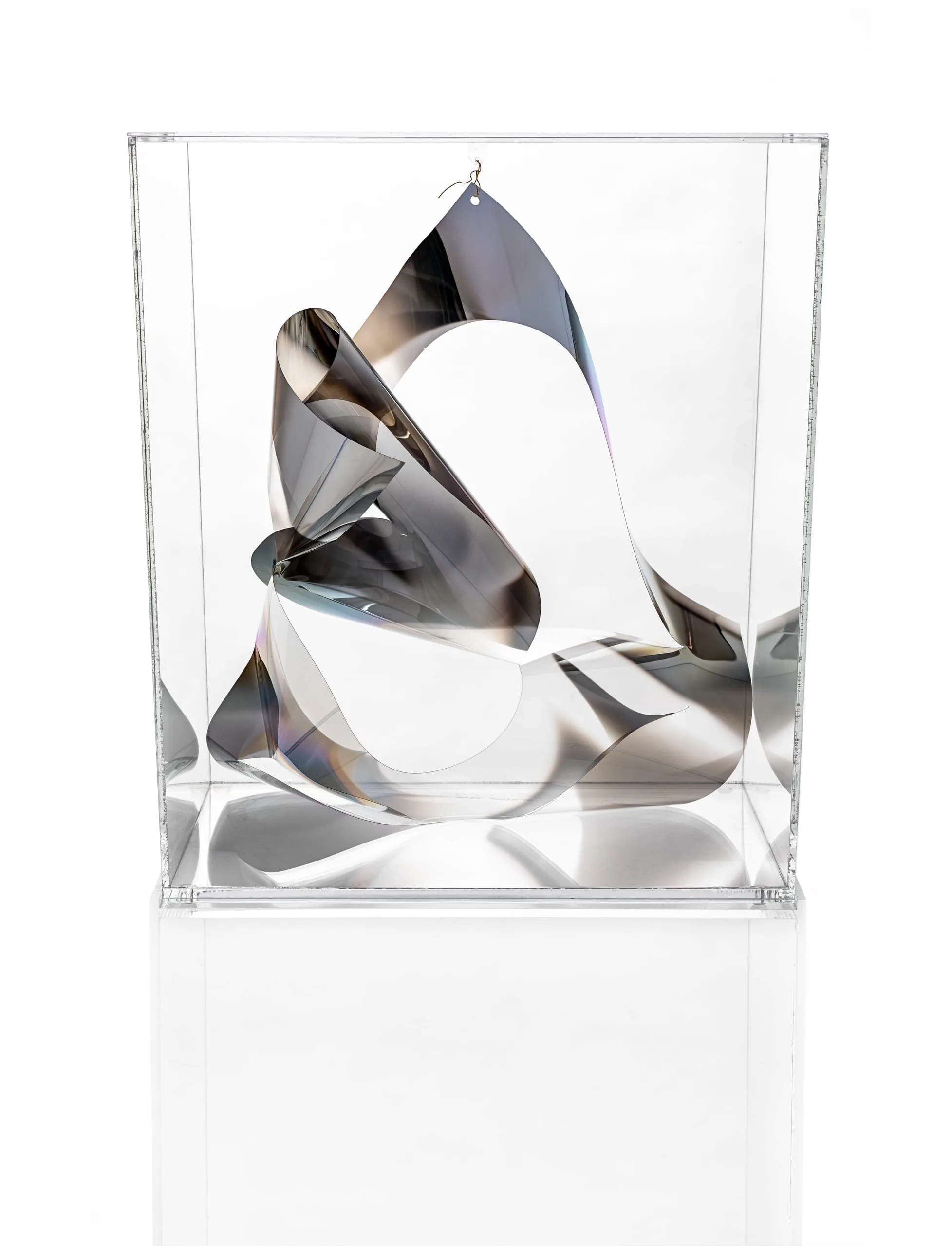 With 3D VD 11/10/15, the artist relocates his attention from fixed, flat surfaces to irregular surfaces curving under the pressure of gravity and their own inner tension. A cut-out mylar fragment becomes the primary site of his experimentation with light, where Bell deposits extremely thin (or vapor-like) coats of aluminum and silicon monoxide, hence the title, “three-dimensional (3D) vapor drawing (VD).” The box containing the fragment is itself irregularly shaped and broadens towards the bottom, in a way complementing the downward motion of mylar. Only secured from one point from the top of the box, the fragment hangs tenuously and drapes onto itself. Its baroque shape and apparent fragility form a striking counterpoint to Bell’s earlier glass cubes.