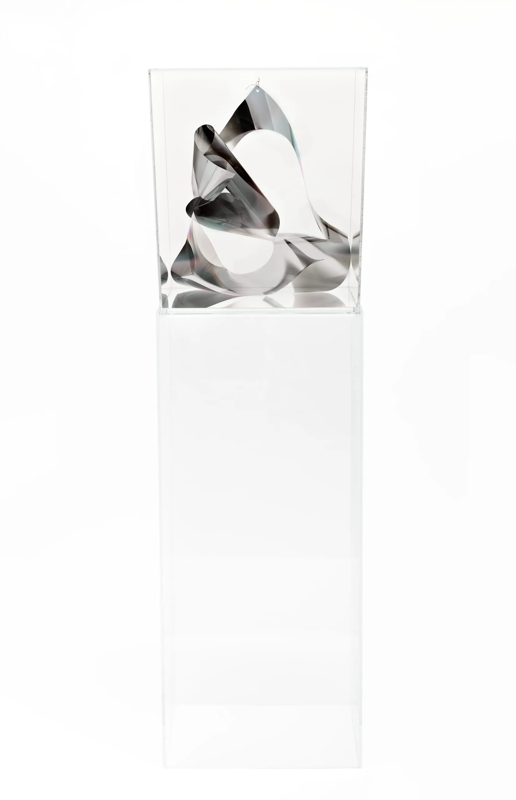 Larry Bell came to prominence in the early 1960s with his parallelogram-shaped acrylic paintings and began experimenting with mirrored and transparent glass during the same period. Soon Bell came to the realization that his paintings were in fact “illustrations of volumes” and “decided to stop painting illustrations of volumes and make the volumes themselves.” Combined with the artist’s preoccupation with light-surface interactions, this drive resulted in vacuum-coated glass cubes with simultaneously reflective, refractive, and light-absorbent sides—Bell’s best-known body of work. Vacuum coating involves the application of an extremely thin layer of metal onto surfaces in a vacuum chamber; the specific metal used and the particularities of application (amount, regularity, etc.) determine the color of the cubes, in addition to defining their visual properties of transparency and iridescence.