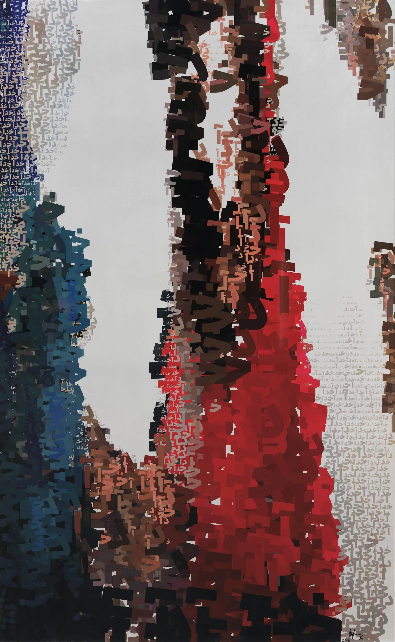 The Persian word for God—Khoda, and its related phonemes, figure prominently in the work of Angela Larian. While its use predates the Islamic period in Iran, written in the Persianized Arabic alphabet first adopted in the later seventh to eighth centuries, it comprises the consonants kha’ (distinguished by a point above the letter) and dal, and the long vowel alif, a single vertical shaft. The letters kha’ and dal are traditionally written connected, followed by the unattached alif. In Larian’s renditions of the word, the letters are often detached from one another, while still retaining the coherence of the word. Larian’s Khoda has a different vitality, a new presence. In this large-scale version, the words cluster and unravel; the colorful letters become abstract forms, modular units of architectonic design. The negative void between the letters achieves its own visual primacy. And yet, for those who read Persian, the kha’-dal-alif are endlessly reconstituted and comprehended as the word Khoda, in much the same way as the deconstructed letters G-O-D will always be understood as God (or dog).