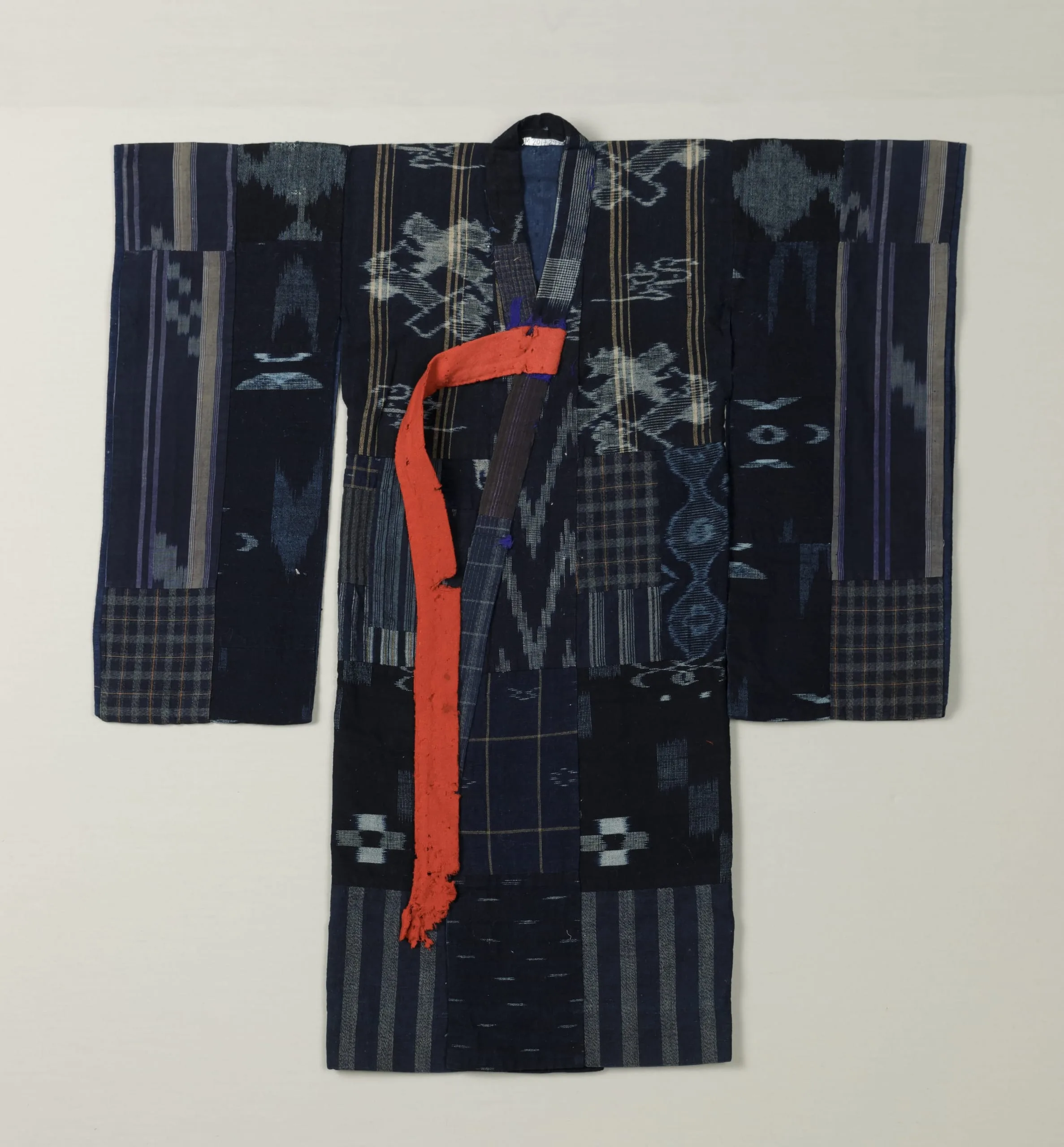 - Cotton plain weave, tie-resist-dyed warp and weft ikat (kasuri), patchwork