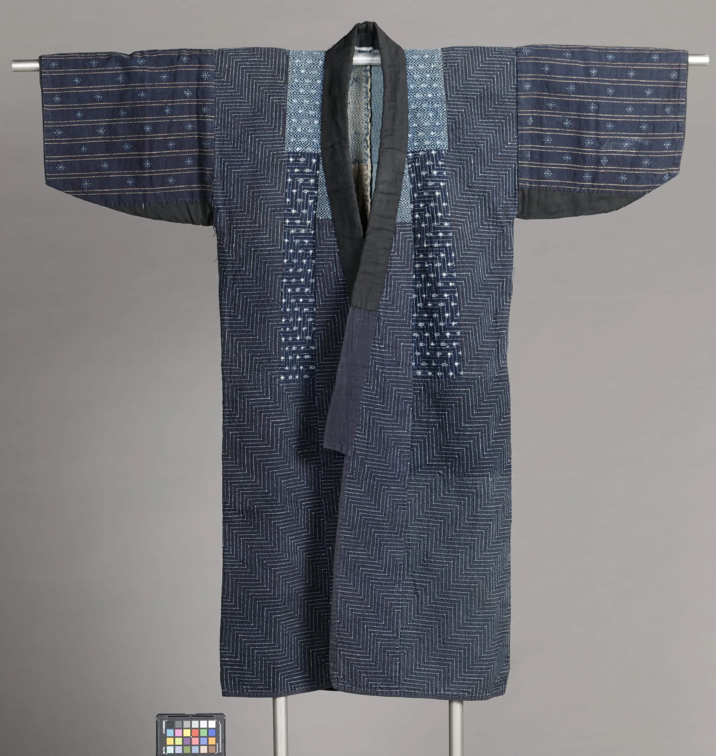 - Cotton plain weave, tie-resist-dyed warp and weft ikat (kasuri), patched and quilted, with cotton embroidery (sashiko; mokko-zashi)
