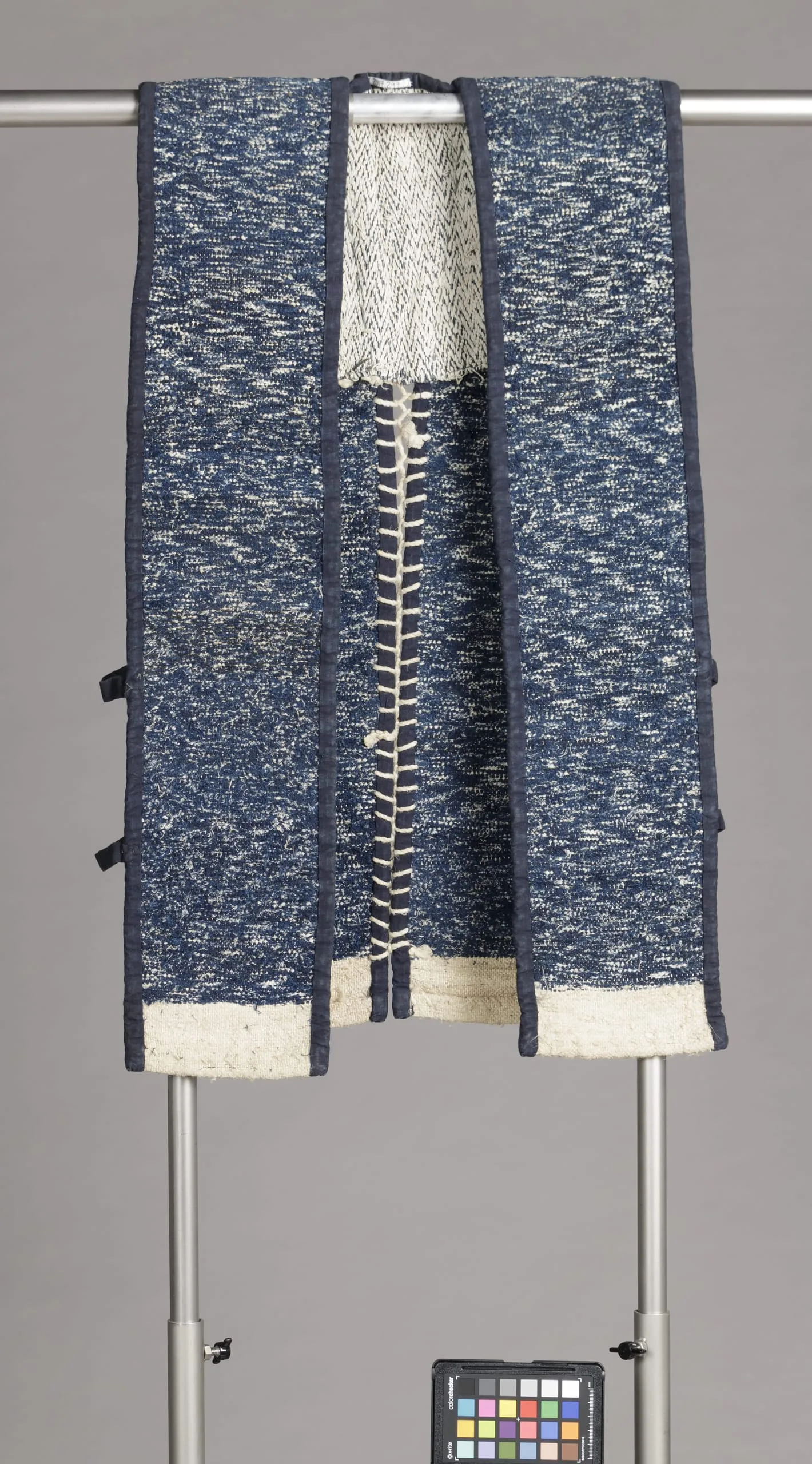 - Bast fiber (asa) warp and cotton rag strip weft plain weave (sakiori), cotton embroidery (sashiko), three-ply bast fiber cord (asa)