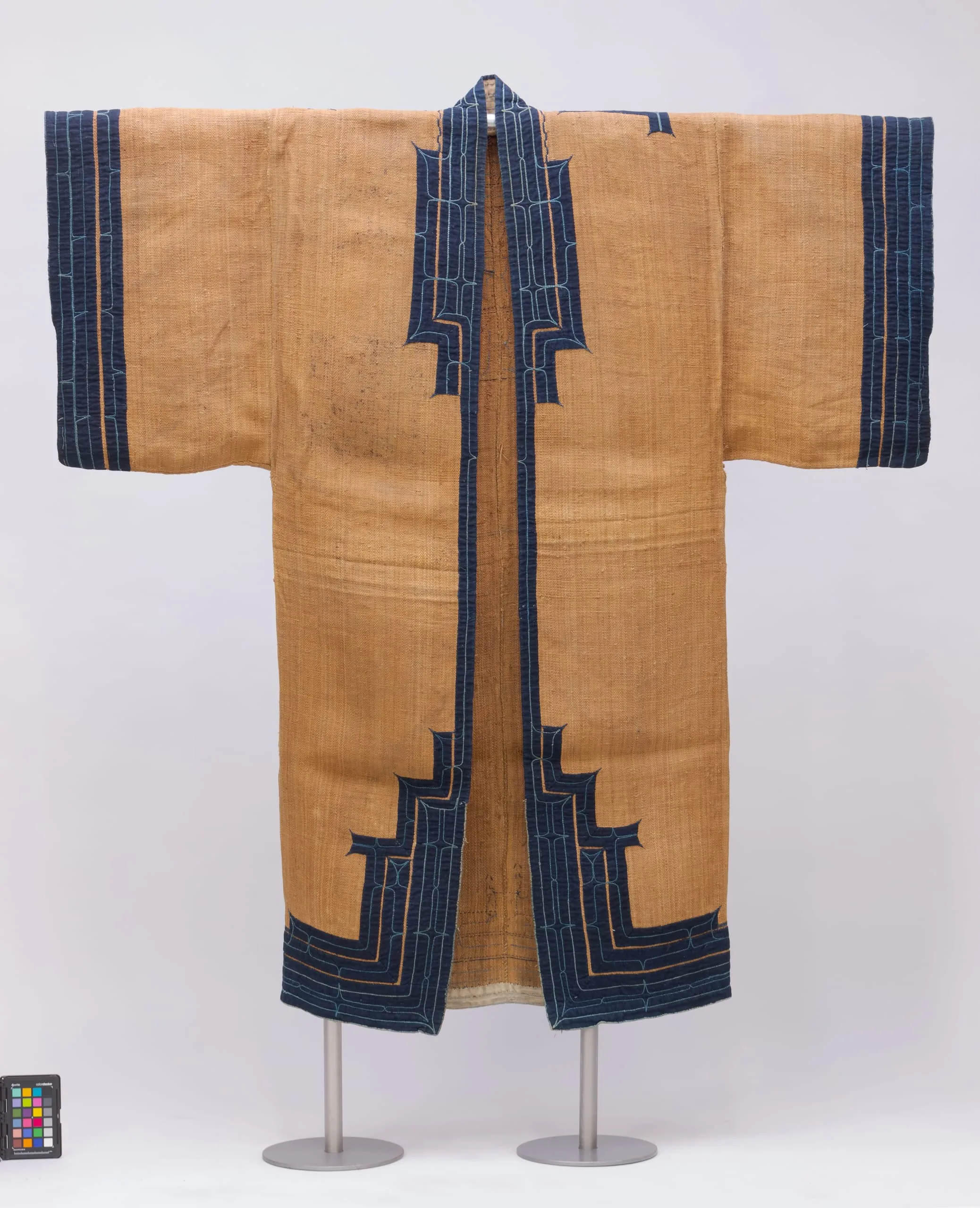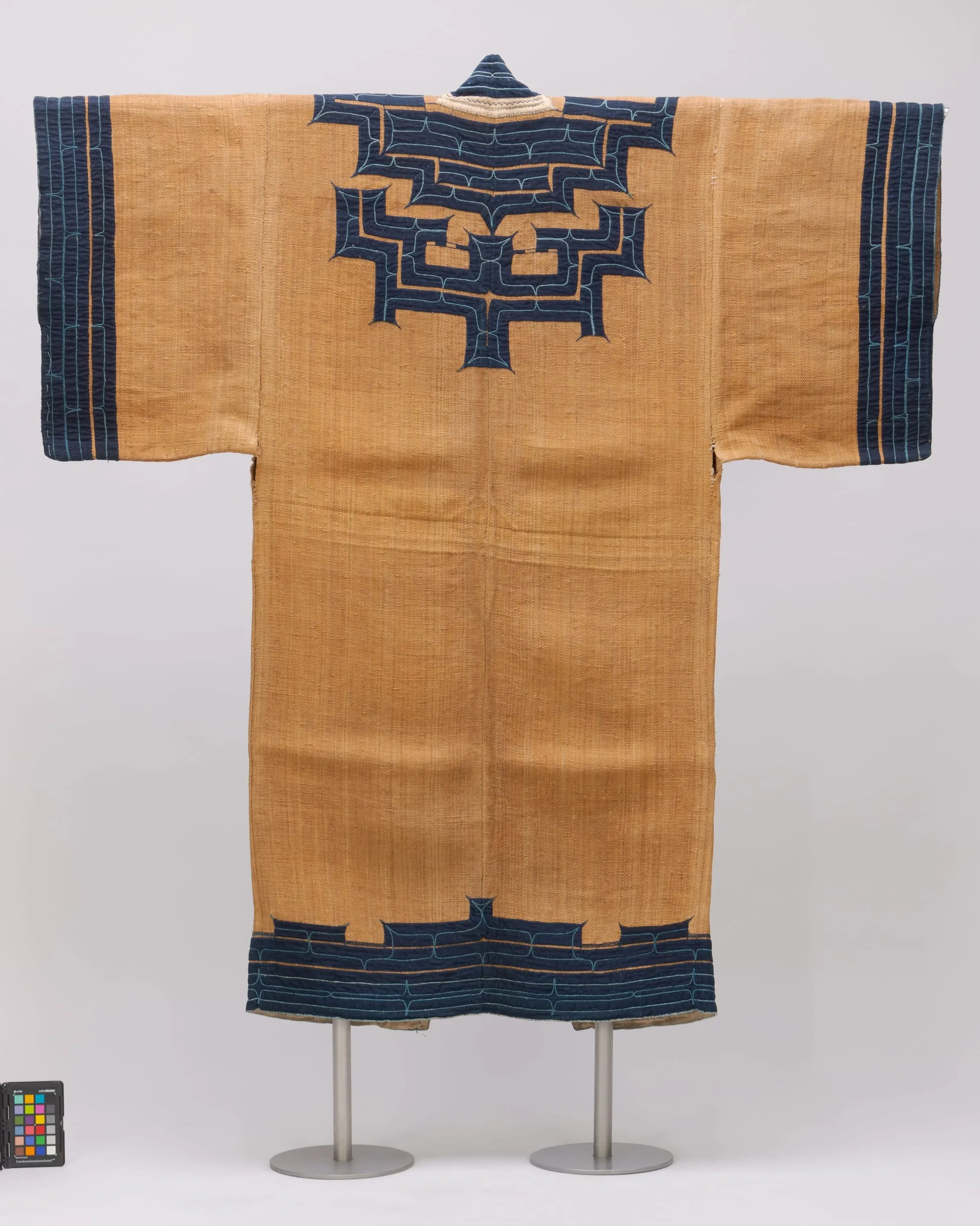 - Elm-bark fiber (ohyo) plain weave with cotton plain weave appliqués and cotton embroidery