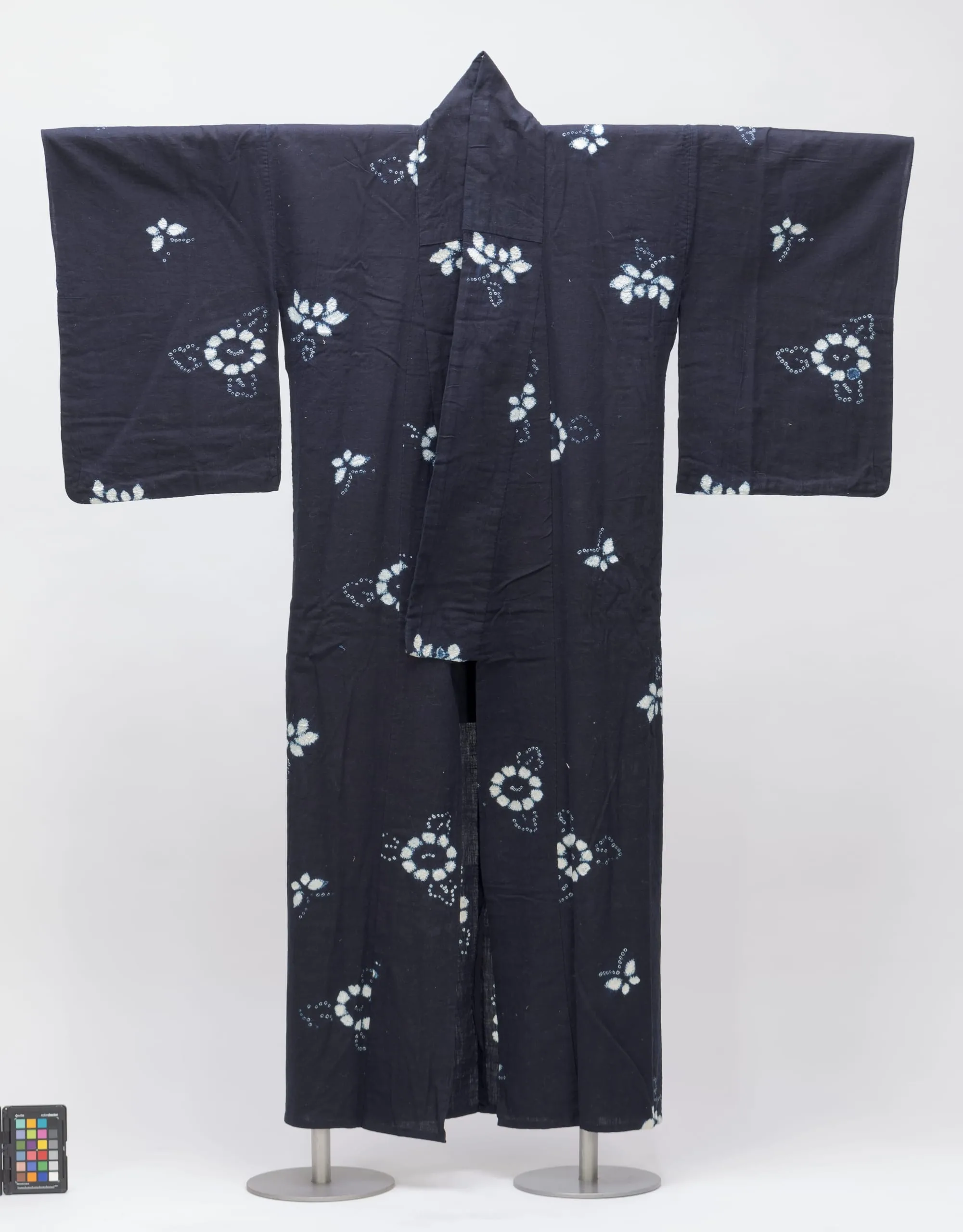 - Handspun cotton plain weave, tie-resist dyed (bōshi and kanoko shibori; yokote shibori)