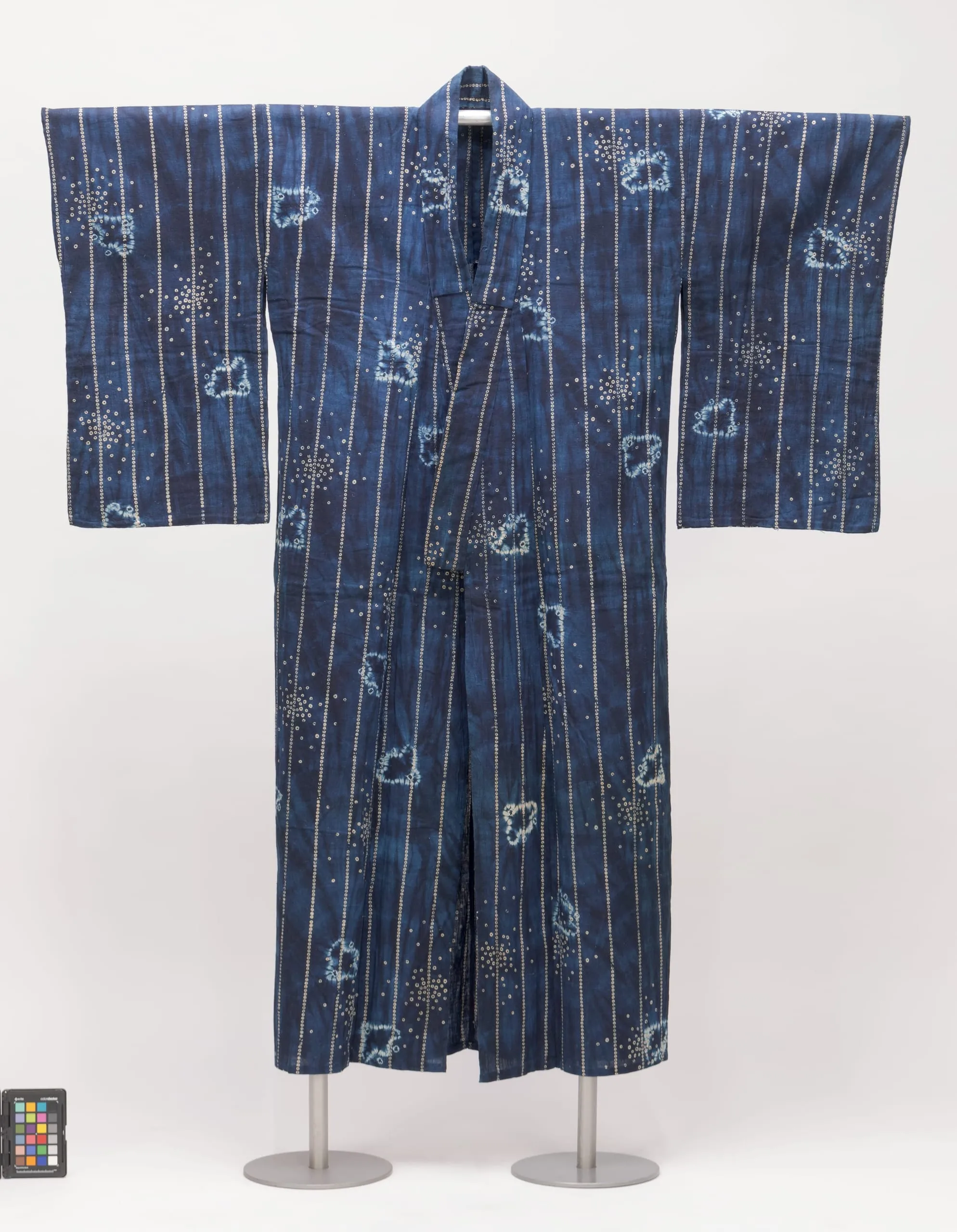 - Cotton plain weave, tie-resist dyed (shibori), stencil paste-resist dyed (katazome)