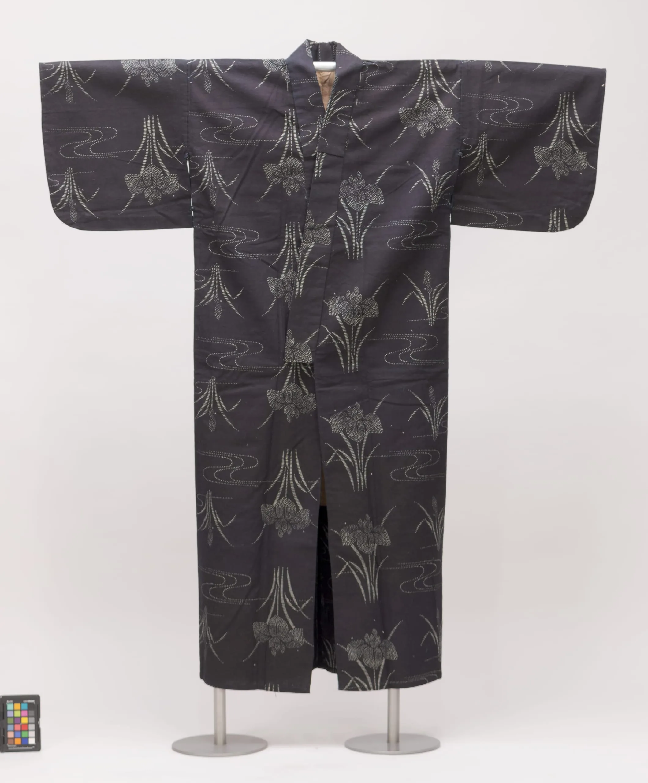 - Cotton plain weave, stenciled paste-resist dyed (katazome)