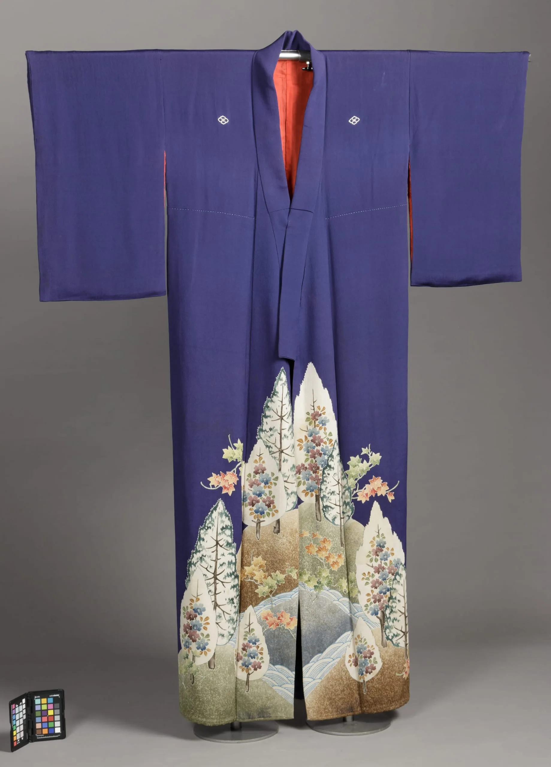 - Woman's Kimono (Kosode) with Stylized Trees, Mountains, Cherry Blossoms, Maple Leaves, and Abstract Water Design (Seigaiha)