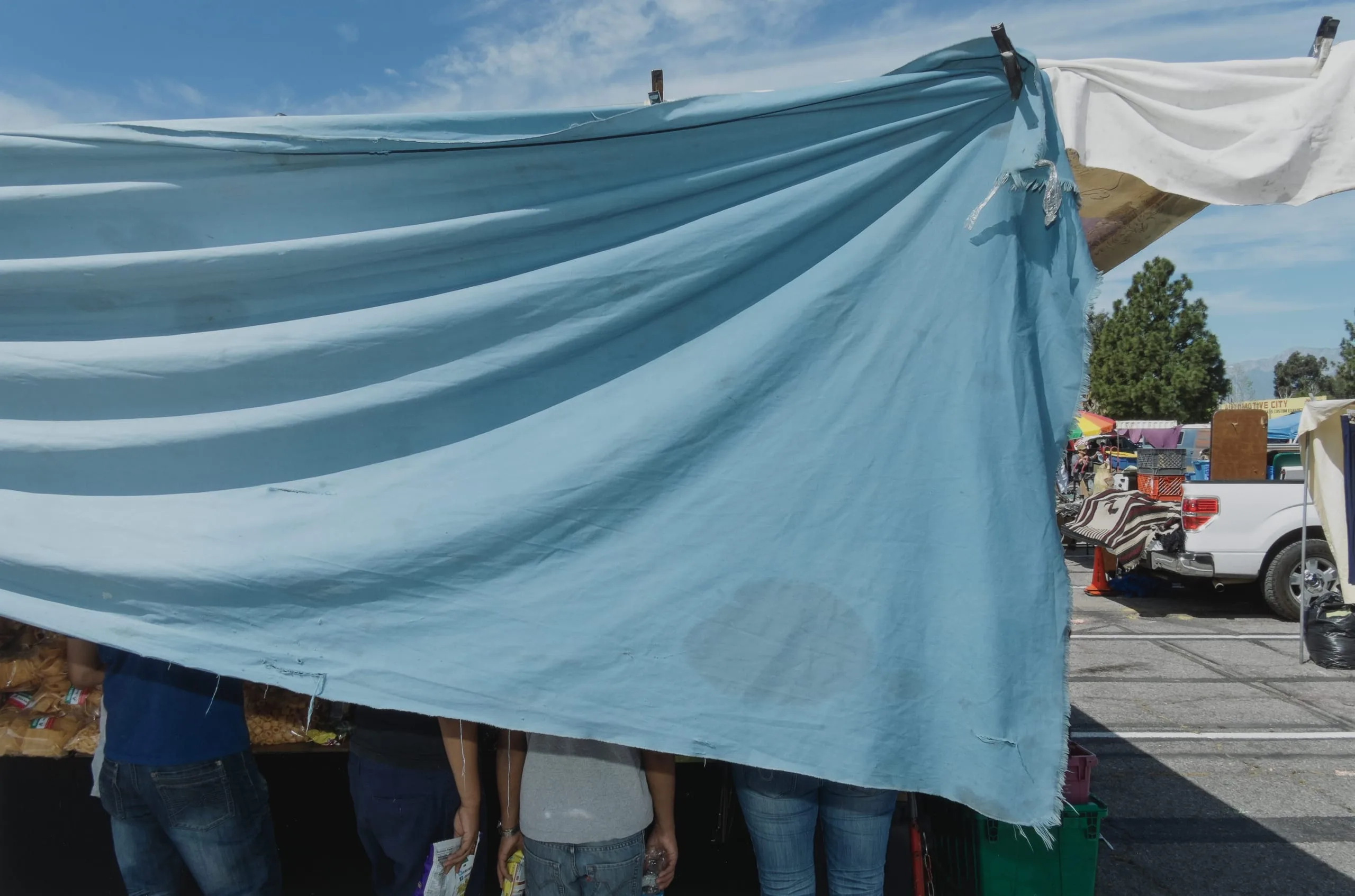 - Untitled (snack customers under stained blue tarp)