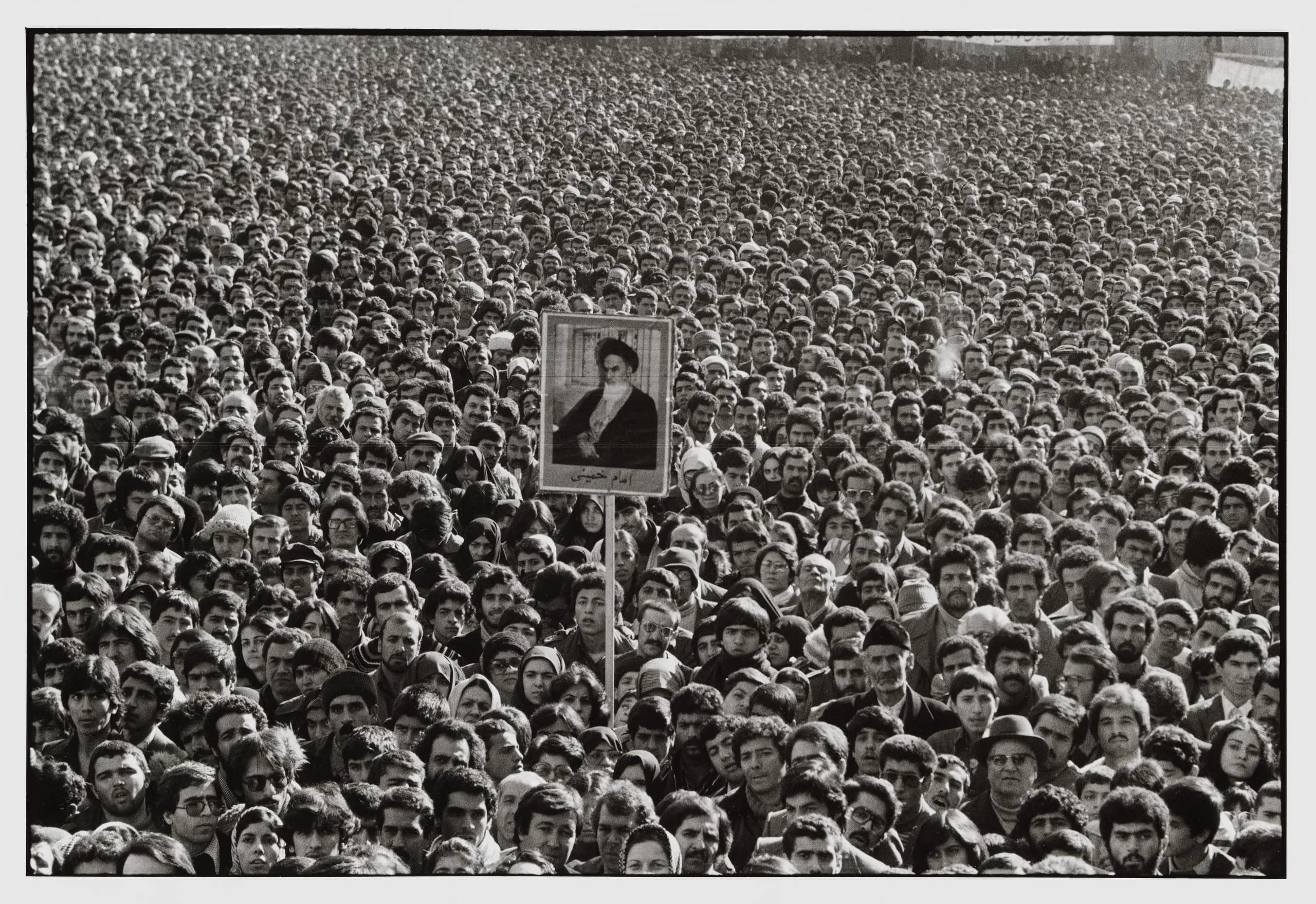 In the tumultuous penultimate days of the shah, protests and strikes paralyzed the nation. Schools and universities were closed, newspapers suspended, and public assembly prohibited. This photograph, in which Ayatollah Khomeini’s portrait is exhibited by a crowd, was taken on January 14, 1979, at the reopening of Tehran University, two days before the shah left Iran.