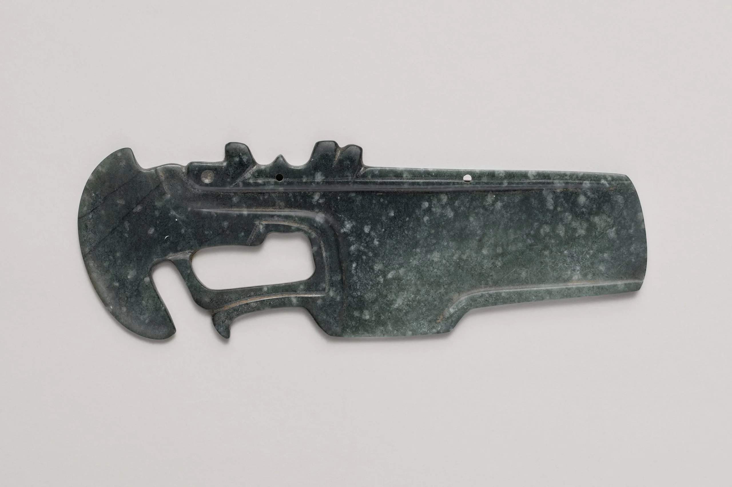 Flat jade implement carved from dark green and gray-white mottled stone, with a hooked left end, cut-through central section, and long tapered blade to the right