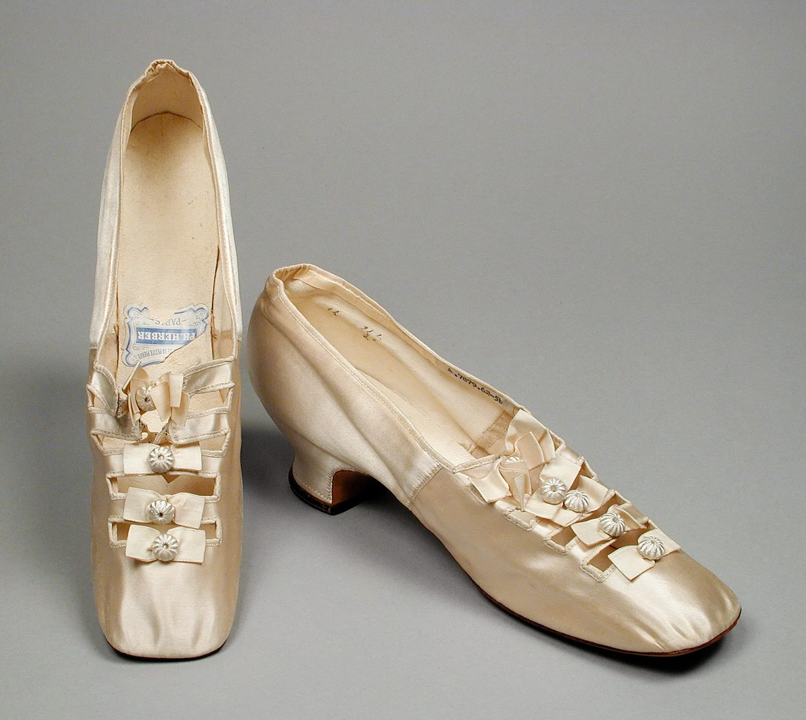 - Silk satin with silk plain weave ribbon, silk covered buttons, and leather