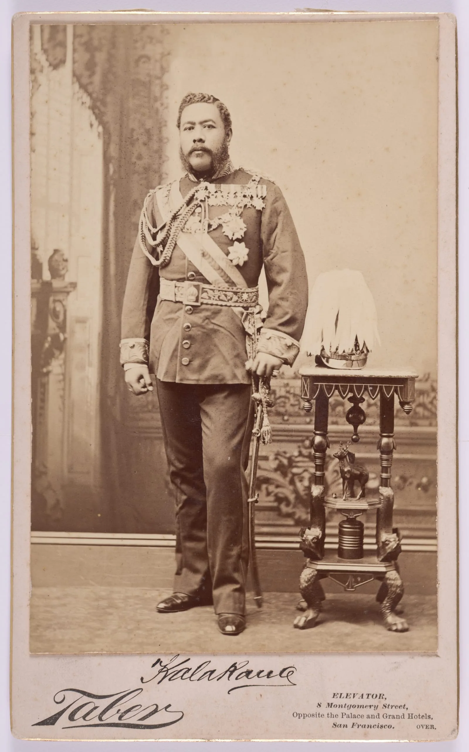 Although King Kalākaua made two trips to the U.S and died in San Francisco (where Taber's studio was located), in 1880 Taber made a six-week trip to Hawai'i where he photographed the King, among other subjects. The following year in 1881 the King visited Taber's studio in San Francisco, so both the location and year of this photo are unknown. (source: Pioneer Photographers from the Mississippi to the Continental Divide by Peter E. Palmquist and Thomas R. Kailbourn page 539)