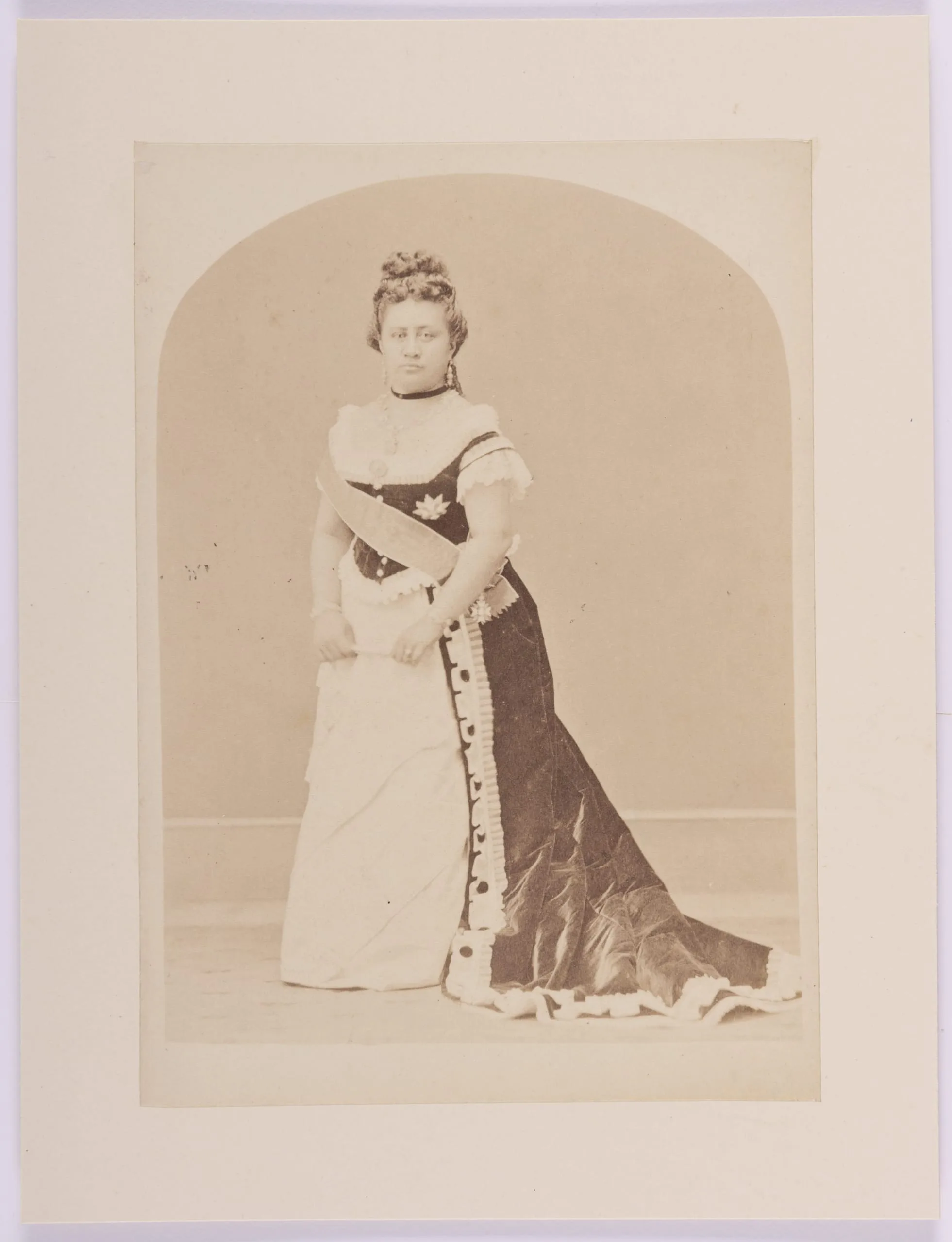 Similar photo (cropped and not full length) found on Hawaii State Archives digital collections, call number:PP-97-15-002, circa 1875, photographer Menzies Dickson and captioned "Queen Kapiolani in her reception dress. She wears the cordon and royal order of Kamehameha I"