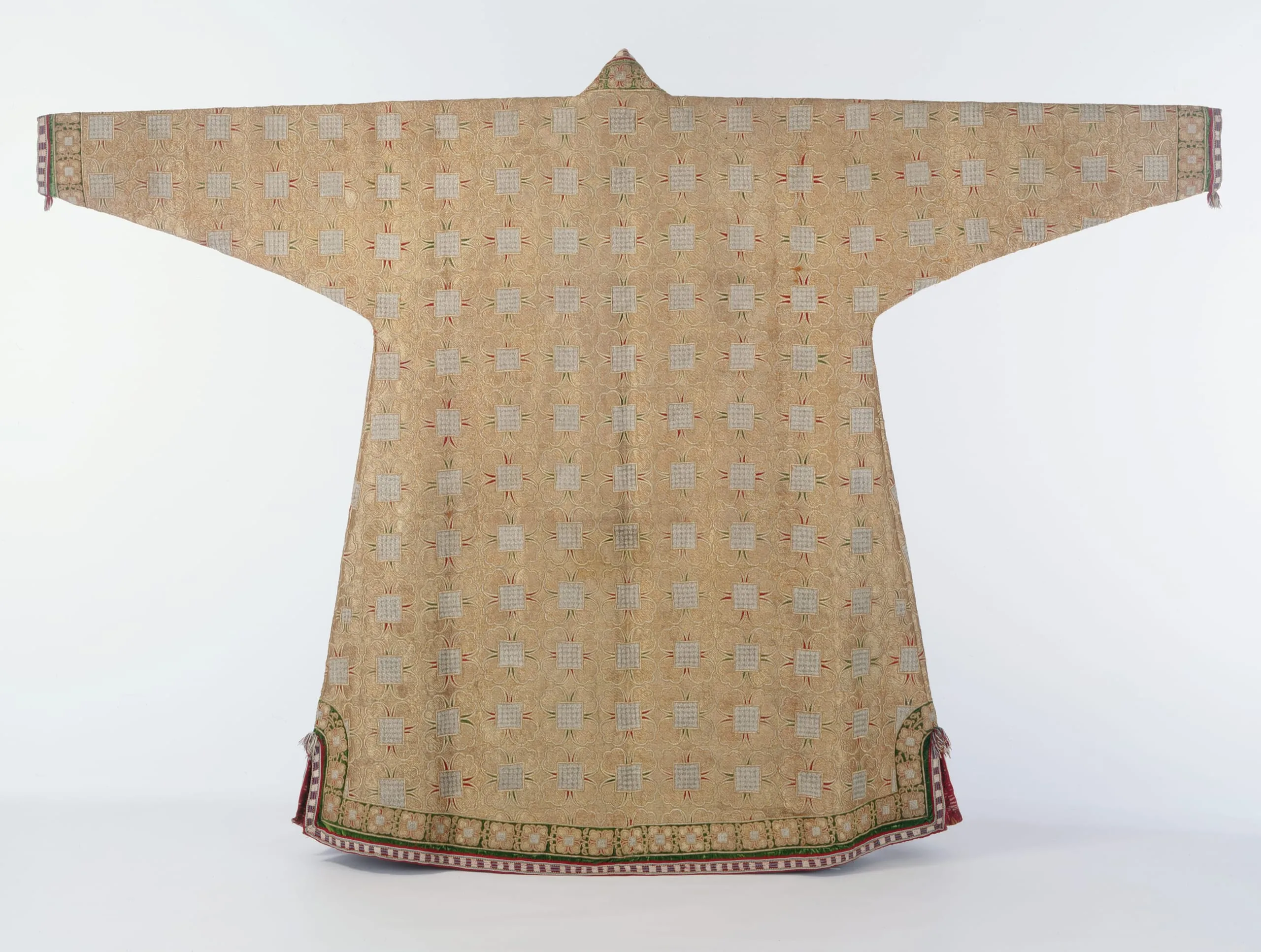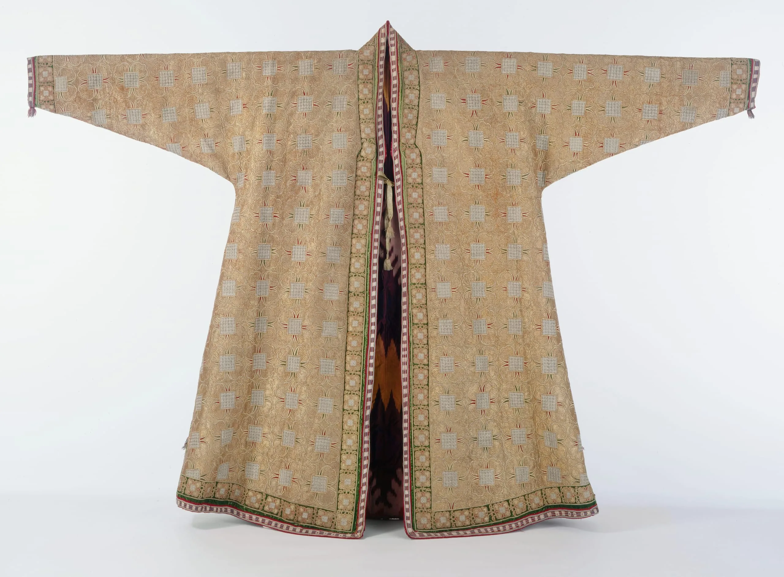 - Metallic thread embroidery on cotton with velvet appliqué; silk resist dyed warps (ikat) lining; silk tablet-woven trim