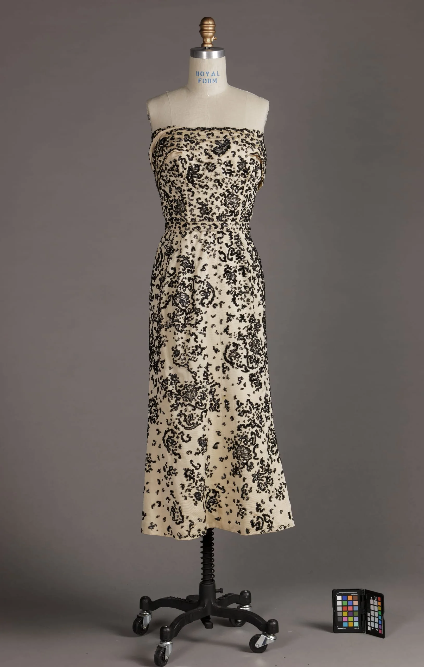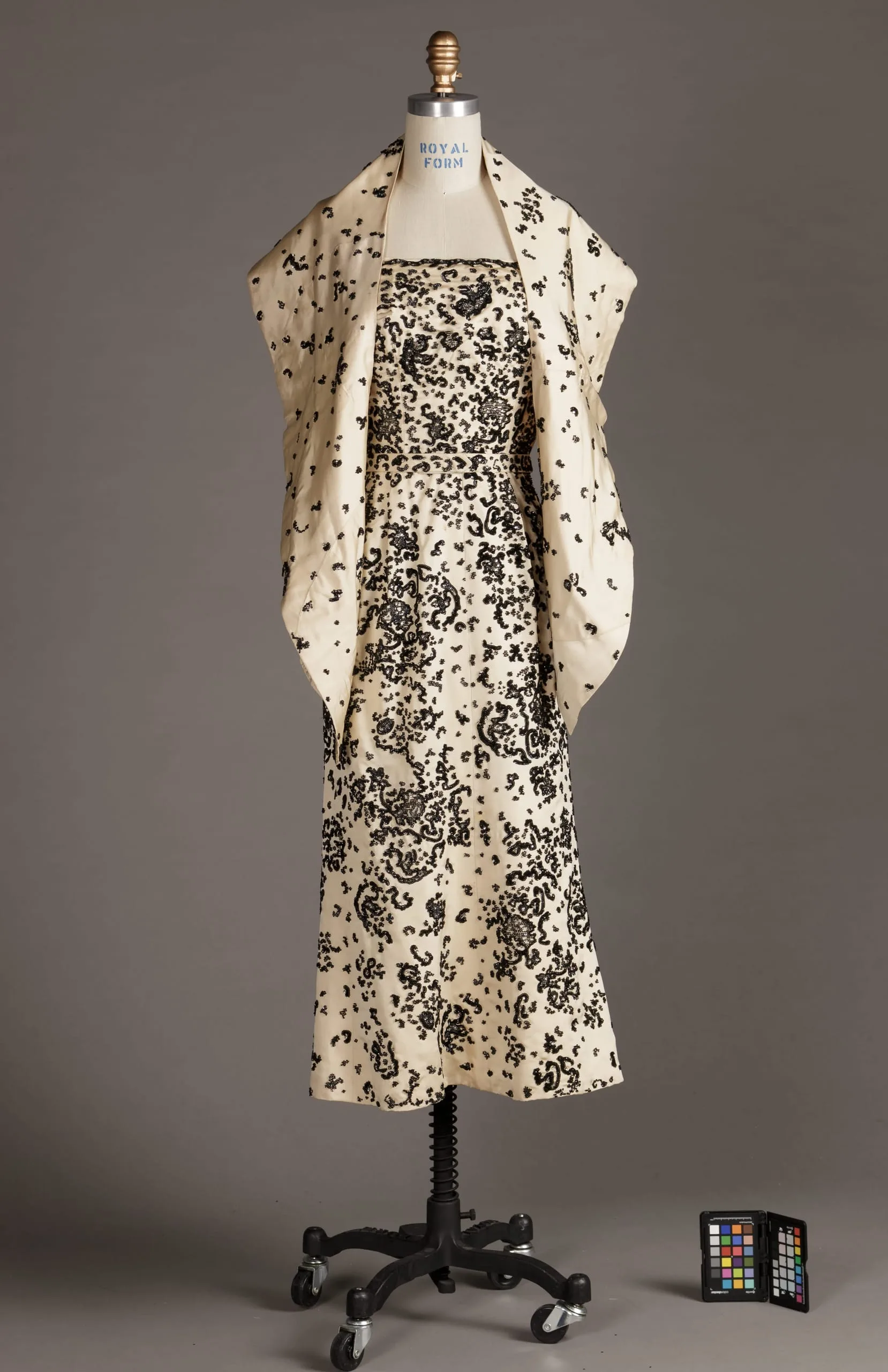 - Silk plain weave (faille), with plastic sequins, glass beads, and crystals.