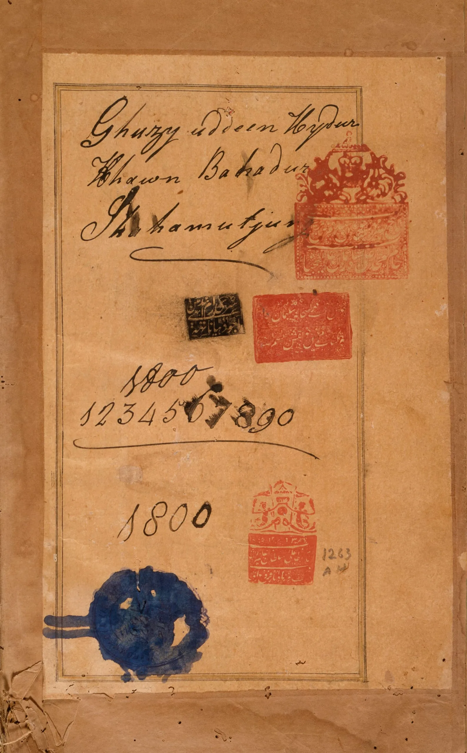 The Qutb Shahi dynasty (or the Golconda Sultanate, 1518–1687) ruled from Golconda Fort and, after 1591, nearby Hyderabad, Telangana. It was founded in 1518 when Sultan Quli Qutb Shah (or Sultan Quli Qutb al-Mulk, r. 1496-1543) declared his independence from the Bahmani Sultanate (1347-1527), which splintered into the independent sultanates of Ahmadnagar, Bijapur, and Berar in 1490; Golconda in 1518; and Bidar in 1528. This illuminated manuscript consists of 450 pages with five illustrations. Its colophon states it was copied by the scribe Habibullah Gilani in 1610-1611 (AH 1019) during the reign of Sultan Muhammad Quli Qutb Shah (r. 1580-1612). There are at least a dozen later ownership seal-stamps and numerous marginal notes by librarians documenting subsequent owners, as well as poetry and aphorisms. Subsequent inscribed dates include 1711-1712 (AH 1123) and 1784-1785 (AH 1199). The large handwritten name at the top of this page reads, Ghazy uddeen Heydur Khawn Bahadur (Ghazi al-Din Haider Khan Bahadur), who was the Nawab (Governor) and then King of Lucknow (r. 1814-1827). The five portraits of the Qutb Shahi Sultans were likely added in circa 1700. The manuscript was rebound with its current tooled leather binding probably in the 19th century.