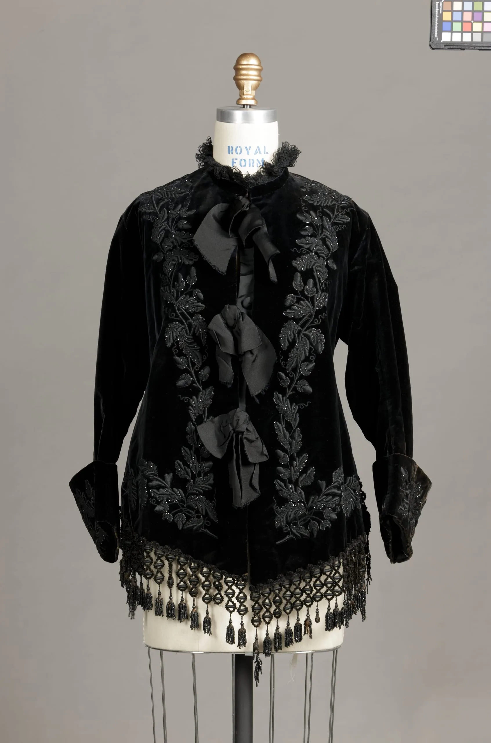 - Silk velvet, silk plain weave (taffeta), silk lace, silk plain weave (faille) ribbons, silk thread embroidery, glass beads, glass bead tassels