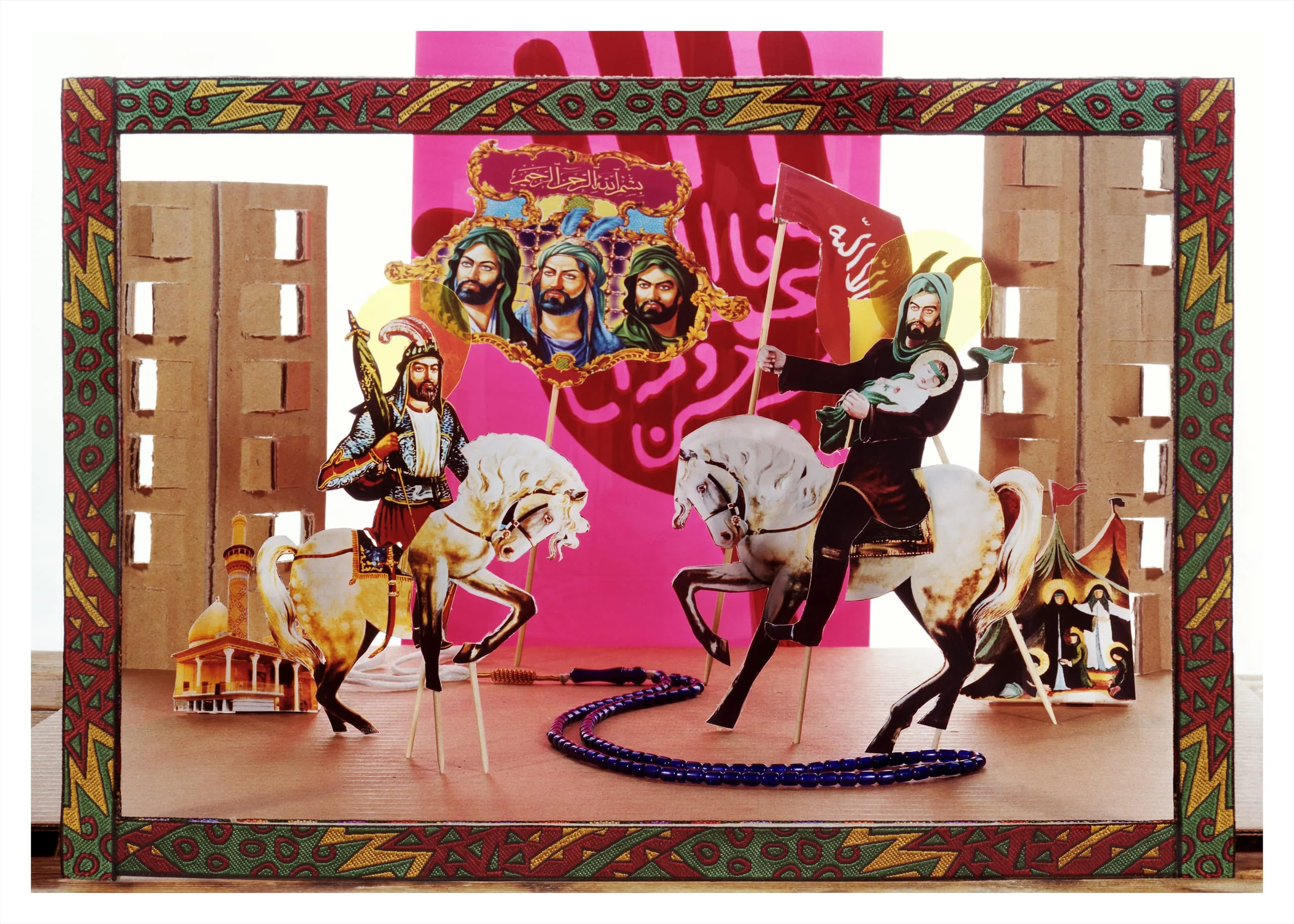 This print is from a series in which the artist collages and photographs popular images (now proscribed in Iran) commemorating the massacre of Imam Husain and his family at Karbala in 680. Such Shi‘ite imagery remains readily recognizable in Iran in much the same way that depictions of martyred Christian saints were commonplace in premodern Europe and are still well known in many places. Ashura imagery, as facetiously recontextualized here, is meant to remove any barriers between past and present so that the viewer can experience the events of Karbala in real time. Here, the horseman at right is Imam Husain with his infant son Ali Asghar, shot with an arrow in the throat while his father held him aloft pleading for water. At left is the imam’s standard-bearer and half-brother, Abbas, who was mutilated and killed while attempting to fetch water from the Euphrates.