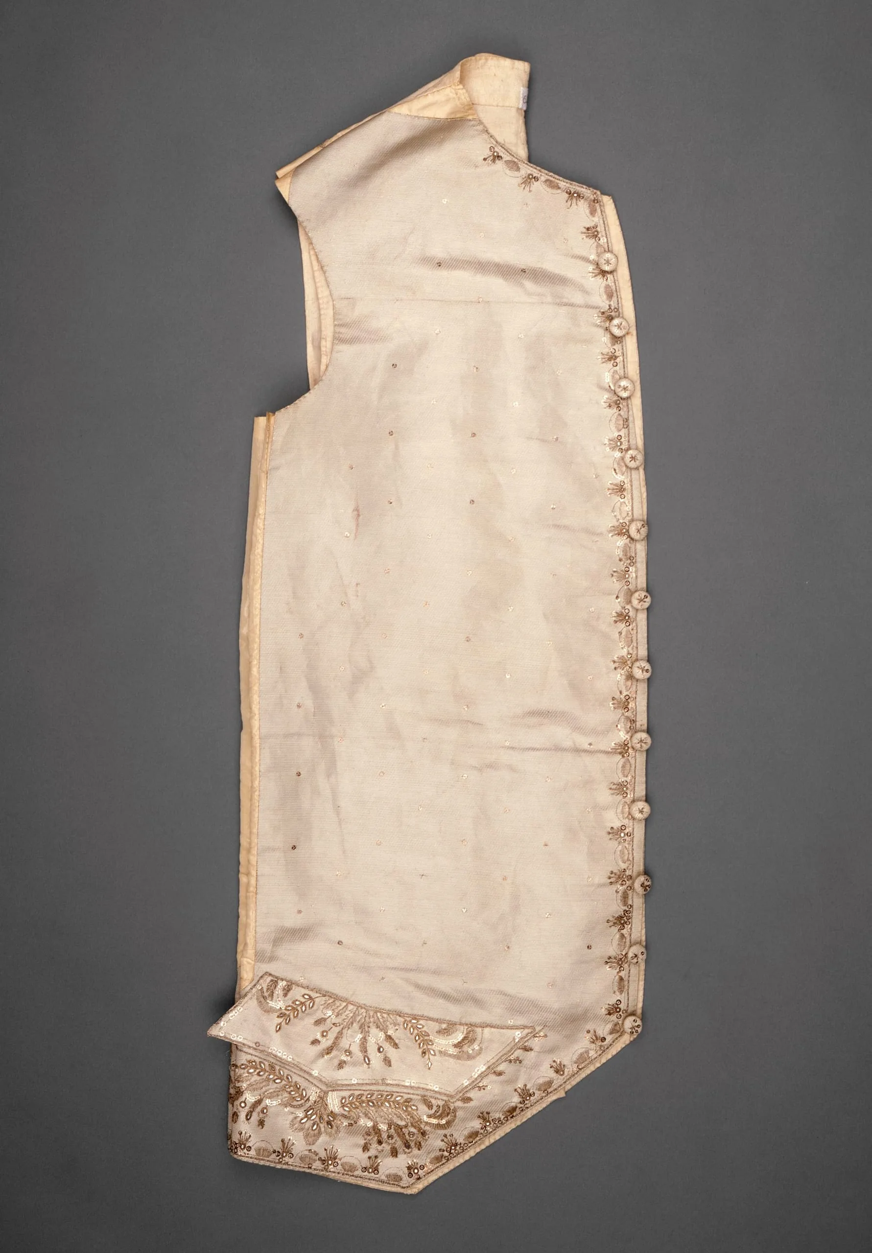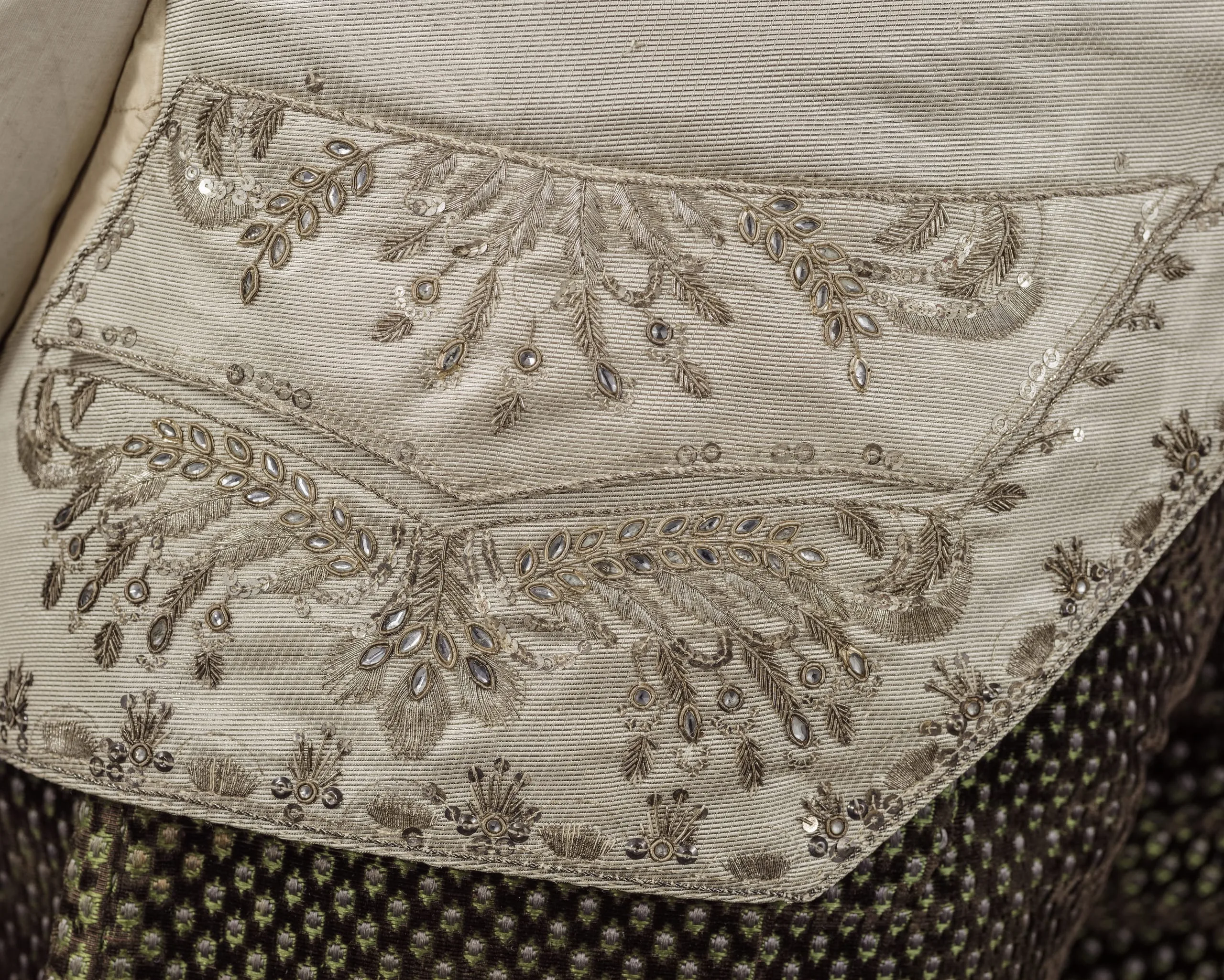 - Silk and metallic-thread twill with metallic-thread embroidery, metallic sequins, and paste (glass) stones