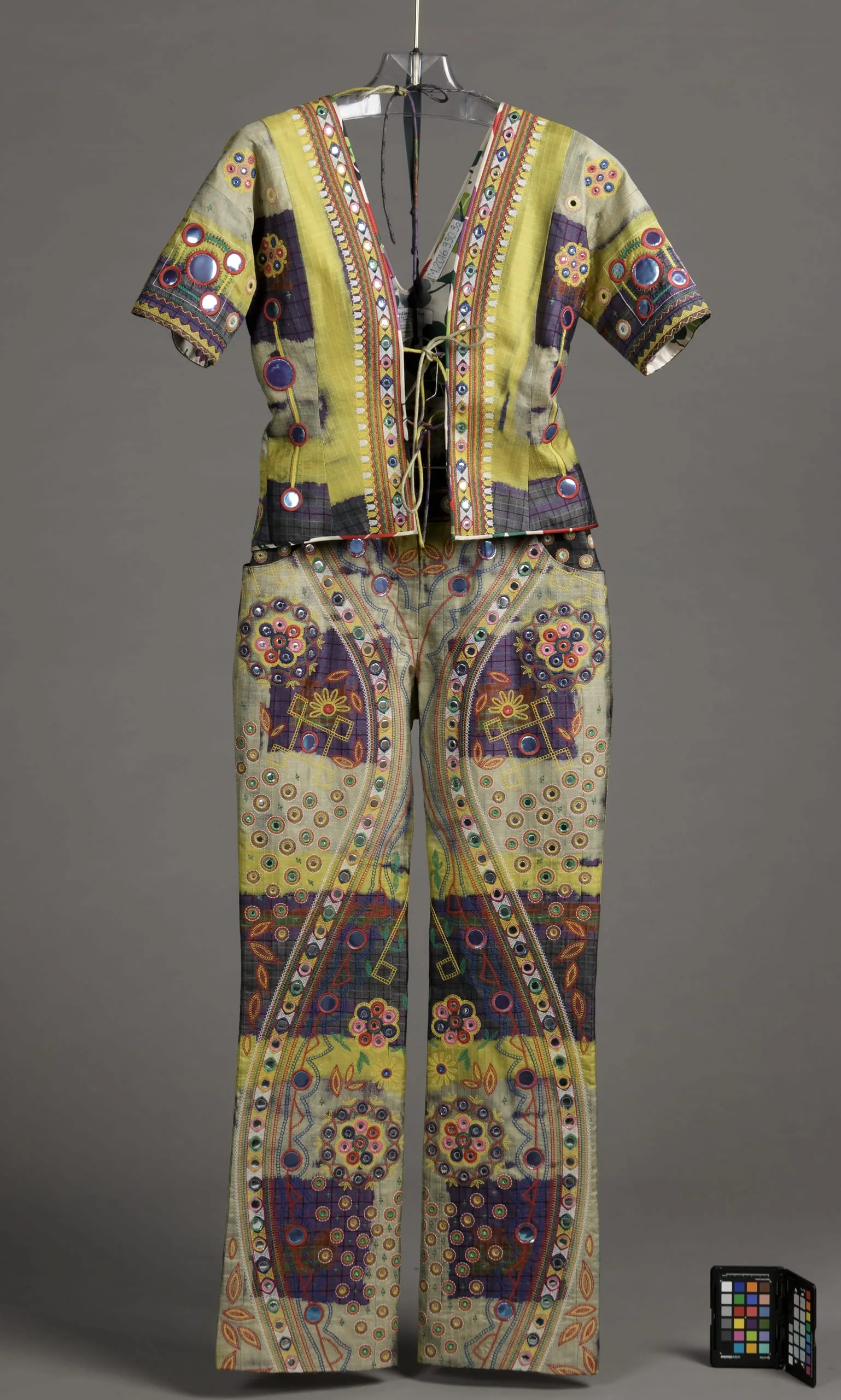 Pants: Silk twill, printed, silk thread embroidery, mirrored plastic appliqué