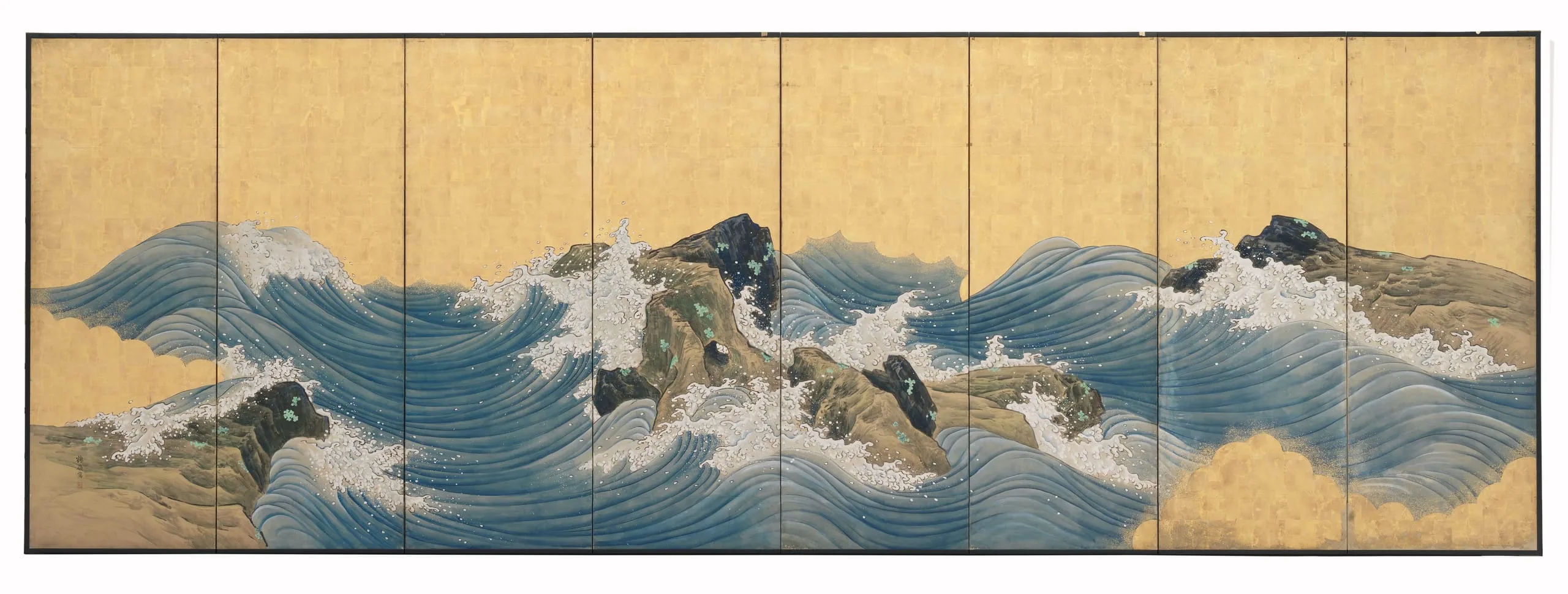 - Pair of eight-panel screens; gold leaf, mineral pigments (including malachite and azurite), and ink on paper
