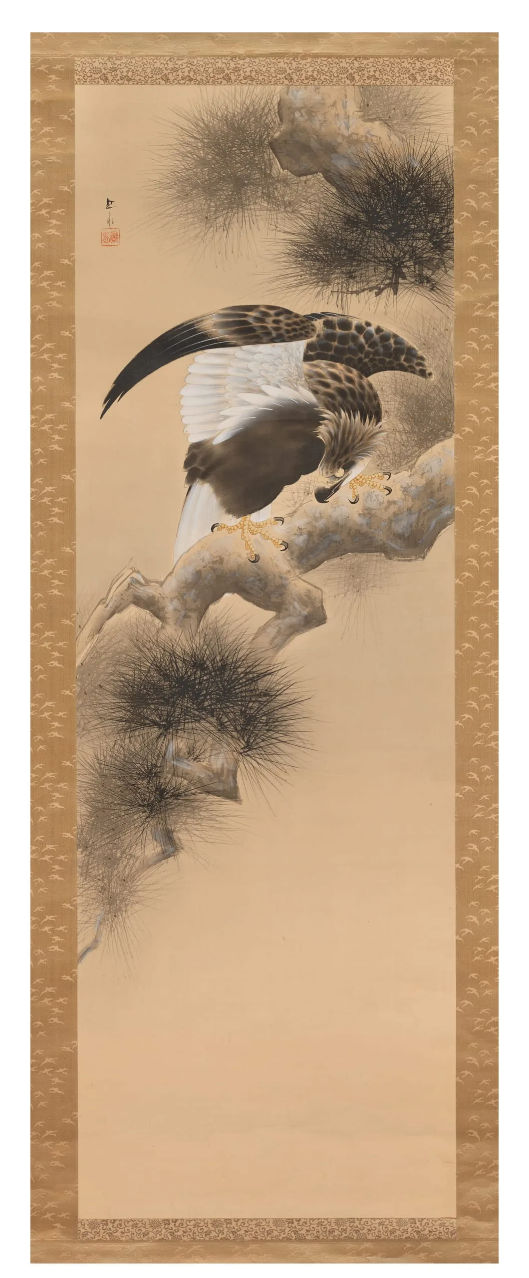 - Hanging scroll; ink, shell white pigment (gofun), and light color on silk