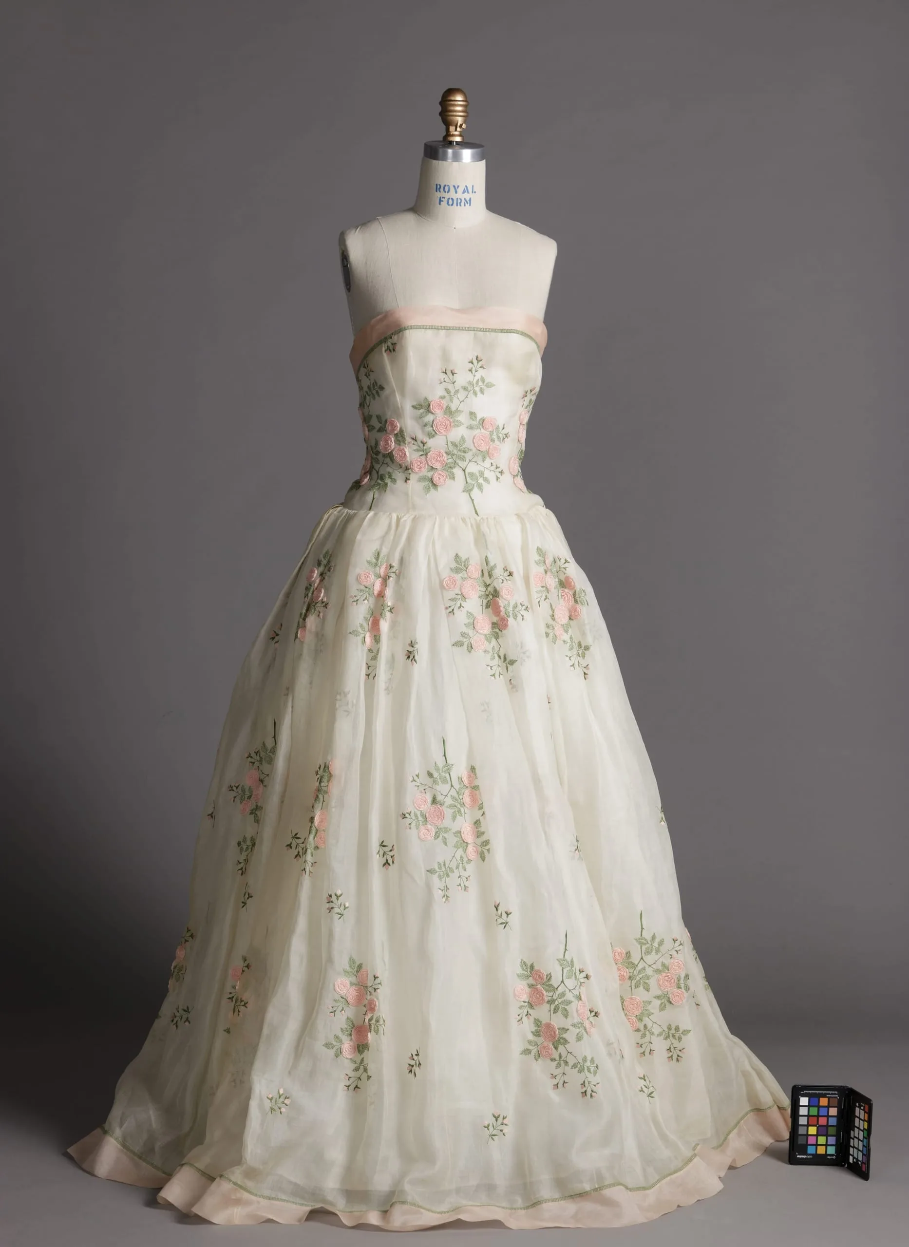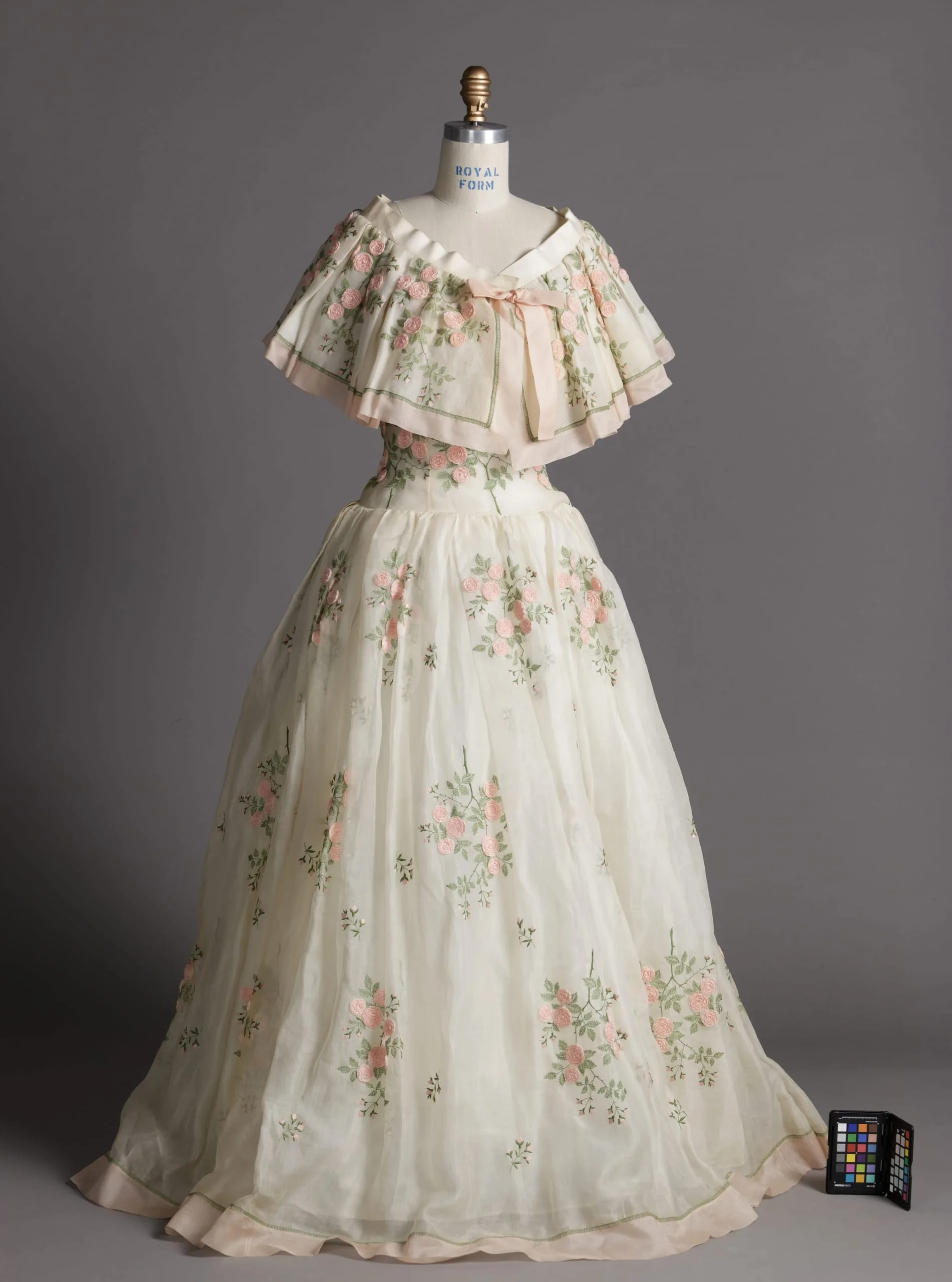 - Silk plain weave (organza) with silk embroidery and silk plain weave ribbon rosettes