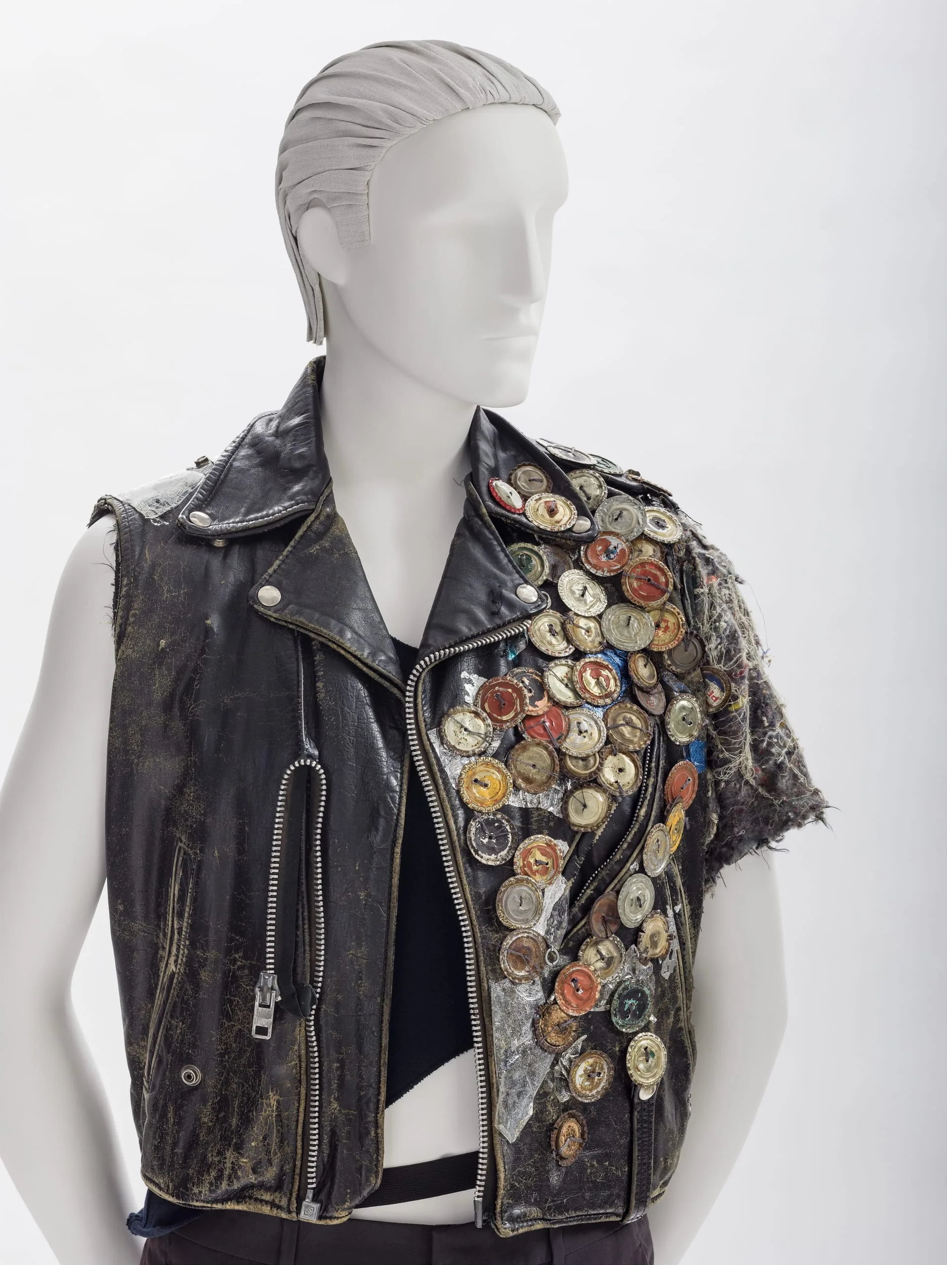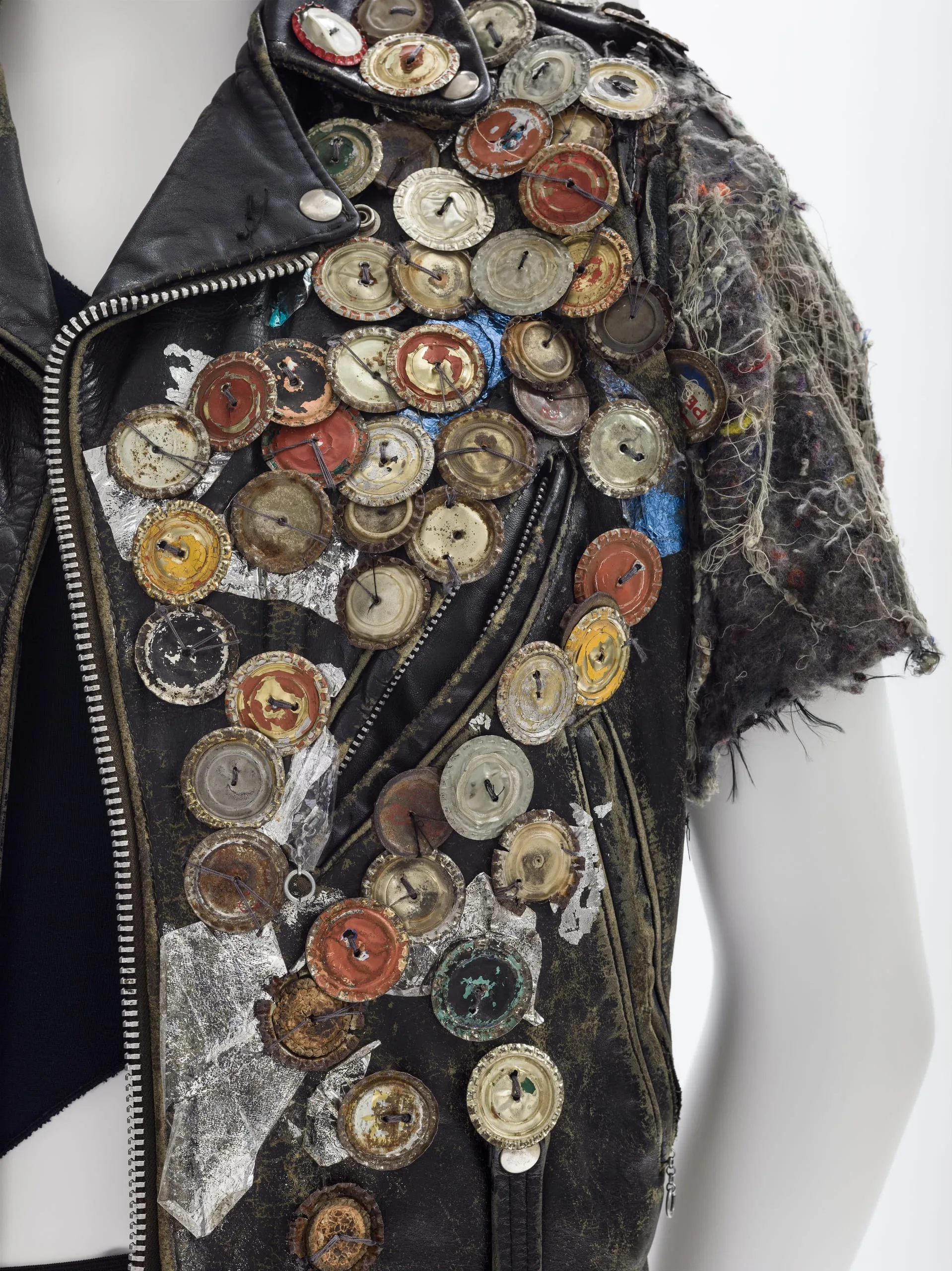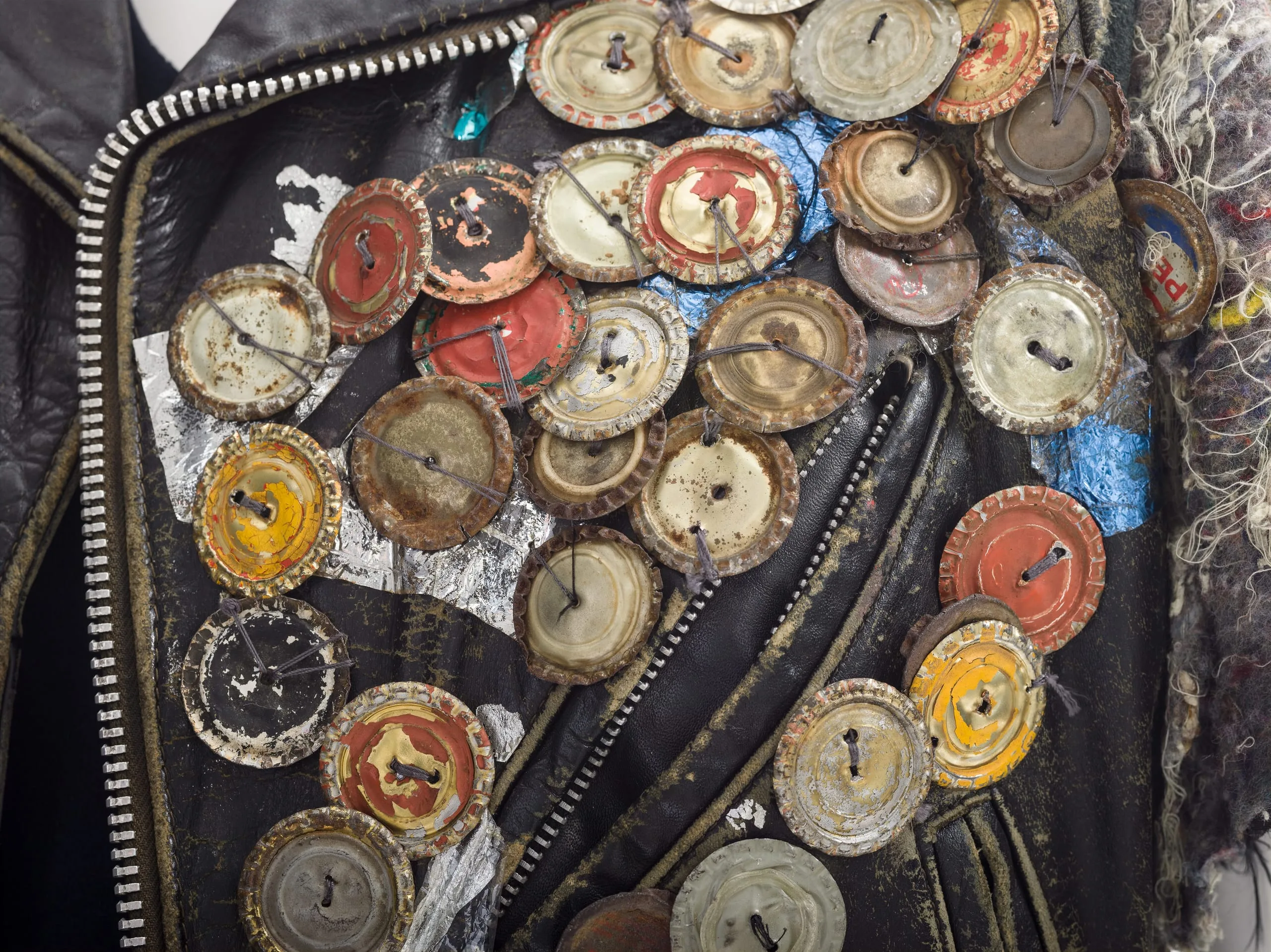 - Leather, synthetic/cotton felt (interfacing), metal bottle caps, and laminated foil