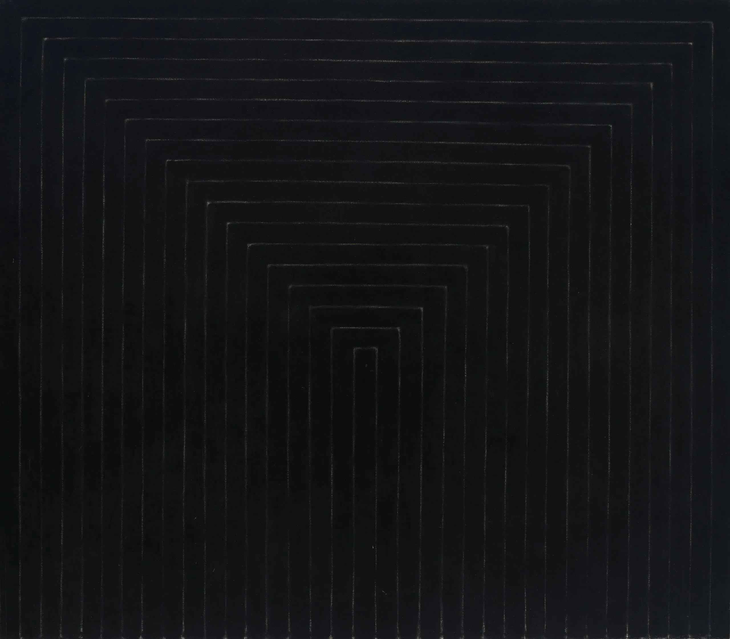 Getty Tomb is one of about two dozen works by Frank Stella known as the Black Paintings (1958–60), which are composed of parallel bands of flat black paint separated by thin lines of unpainted canvas. To make these works, Stella applied commercial paint with a house painter’s brush, which dictated the width of the black stripes. Eliminating illusionistic space and any narrative or symbolic allusions, this series called attention to the physical properties of paint and canvas, conveying Stella’s statement that “what you see is what you see.” With their highly controlled brushwork and minimal compositions, the Black Paintings were a radical departure from Abstract Expressionism.