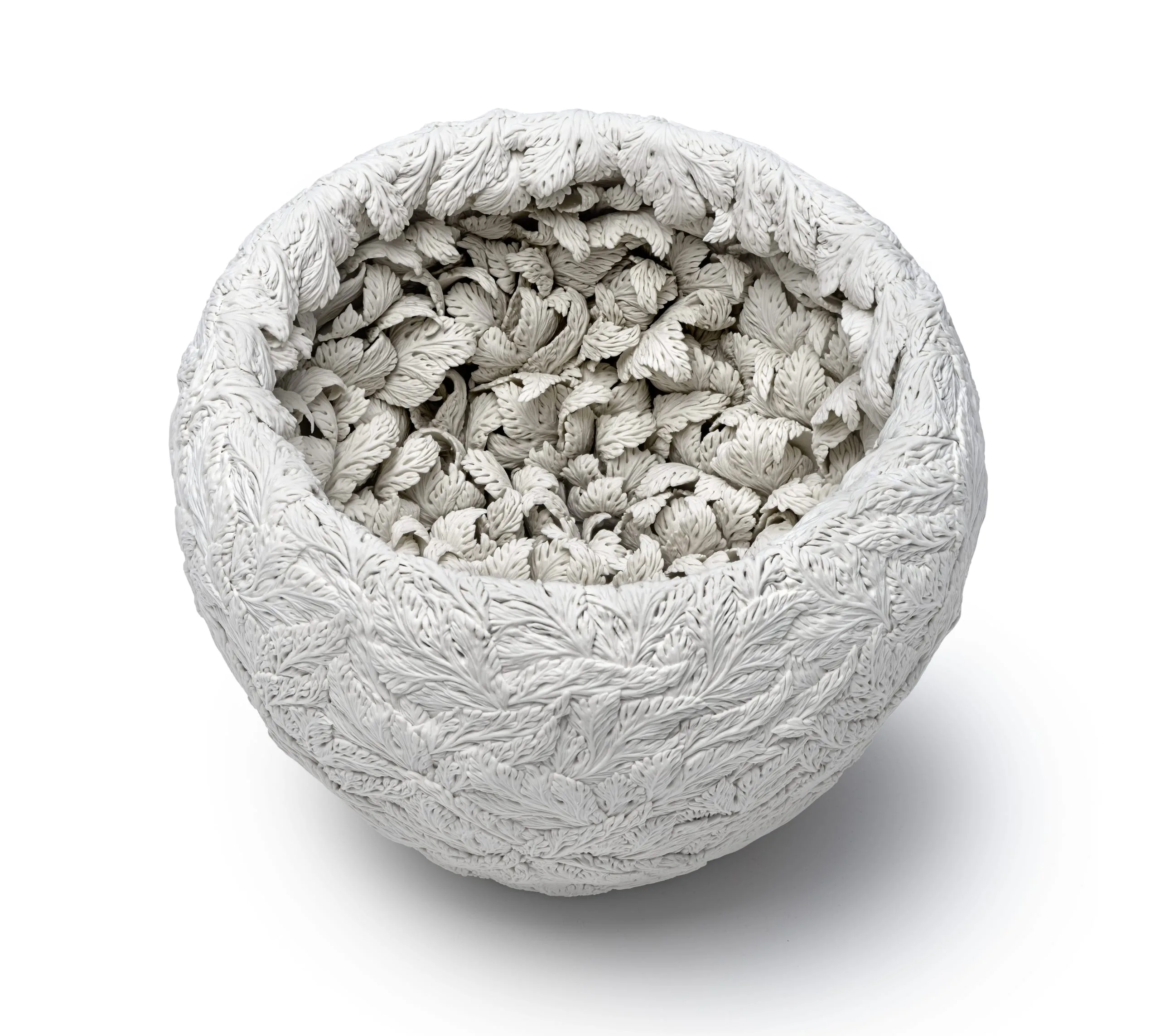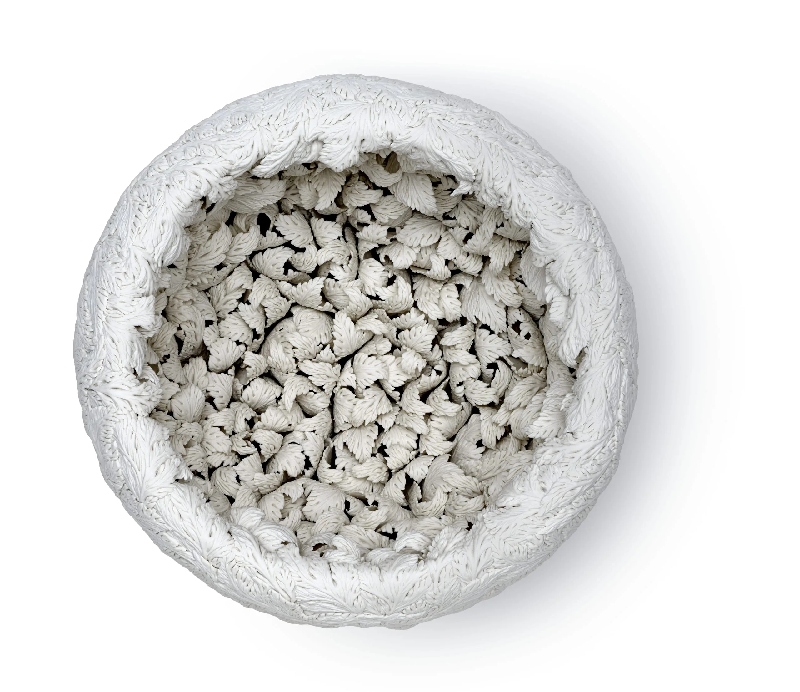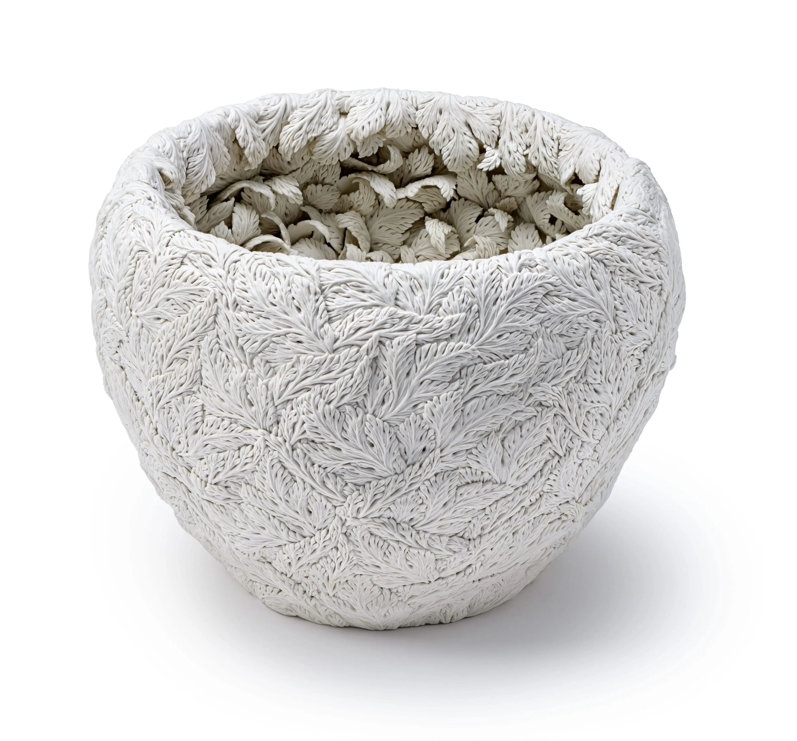In 2008, while studying for a postgraduate degree at London’s Royal College of Art, Japanese artist Hitomi Hosono learned the ceramic technique of "sprigging" through an internship at the 250-year-old Wedgwood factory in Staffordshire. Sprigging is an ancient technique of applying low-relief decoration; its popular name derives from the plant-based motifs produced by European ceramics manufacturers like Wedgewood from the eighteenth century onwards. Once Hosono mastered Wedgwood’s industrial press-mold process, she began to experiment with the properties of the clay. By modifying the clay’s composition to increase its strength and flexibility, Hosono liberated the molded elements from their supporting surface. This technical achievement forms the basis of her ongoing work. In characteristic pieces such as A Leaves Bowl, her organic ornament is so thick that it completely obscures the core and lifts away from the rim as if caught by a gentle breeze.